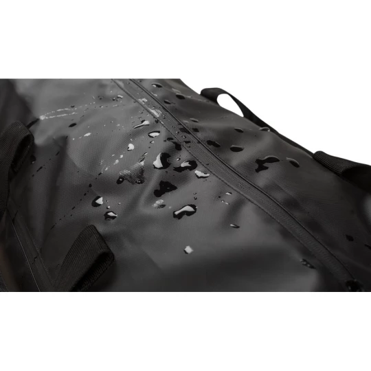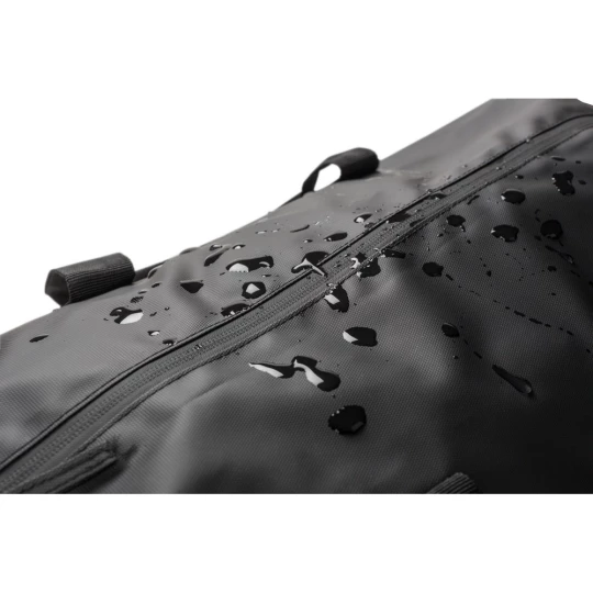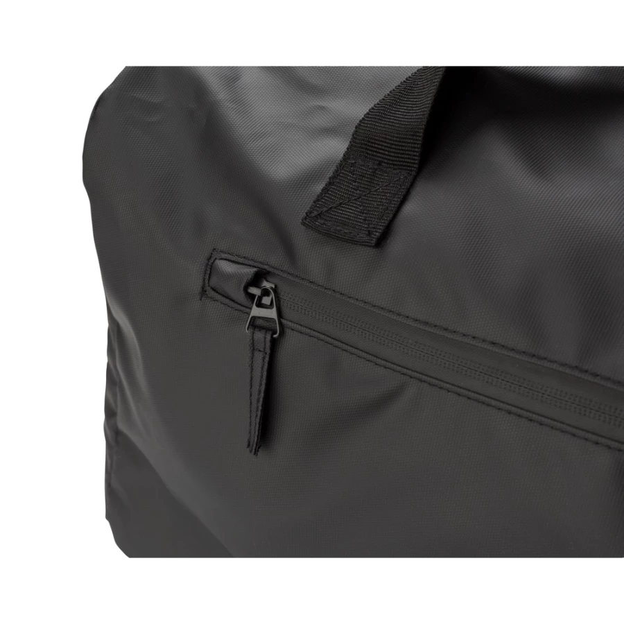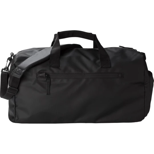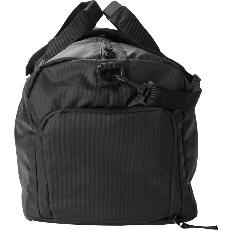 Wodoodporna torba podróżna, wykonana z poliestru, ze wzmocnionym dnem, kieszenie zamykane na zamek błyskawiczny, kieszeń na buty, kieszenie po obu stronach, pasek na ramię, uchwyty,