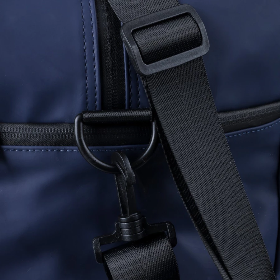 Torba sportowa, podróżna o pojemności 35 litrów, długie uchwyty do noszenia na ramieniu (2,5 × 108 cm) z zapięciem na rzep, regulowany pasek na ramię (3,9 × 130 cm), mała przednia kieszeń zapinana na zamek, duża główna komora zapinana na zamek, ikona recyklingu na metce, produkt wykonany z PU z recyklingu z podszewką z recyklingowego poliestru 210D