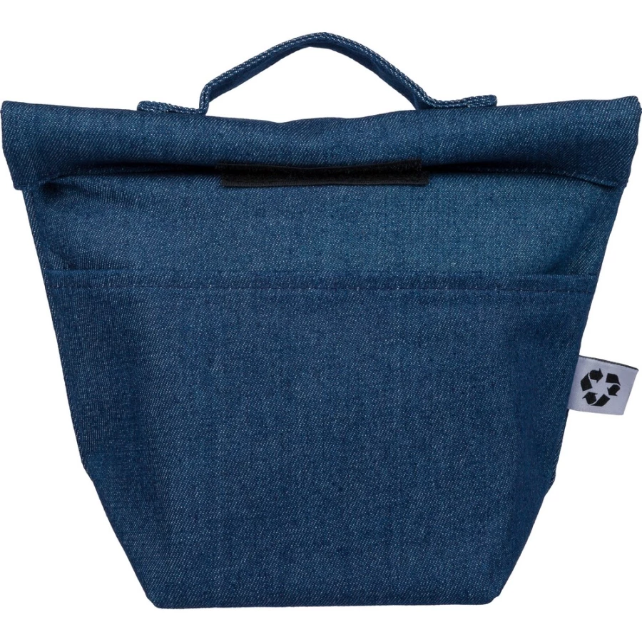 Torba termoizolacyjna o pojemności ok. 8 litrów, krótki uchwyt do noszenia, kieszeń z przodu, zapięcie na rzep, PEVA w środku, ikona recyklingu, produkt wykonany z denimu z recyklingu