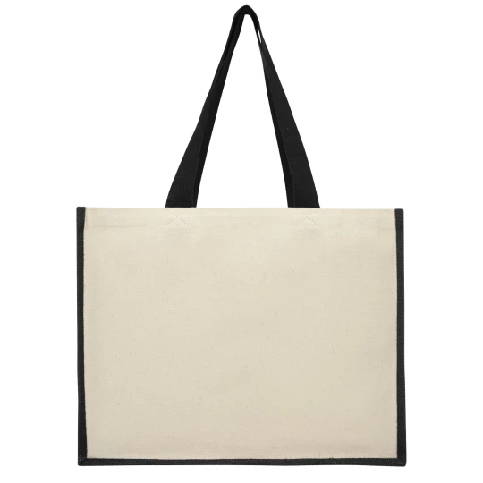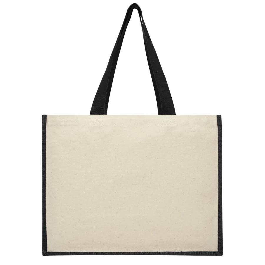 Modna torba na zakupy z panelami bocznymi z łatwego do nadrukowania płótna 320 g/m² i wyjątkowych ramek z laminowanej juty, z uchwytami z bawełny.