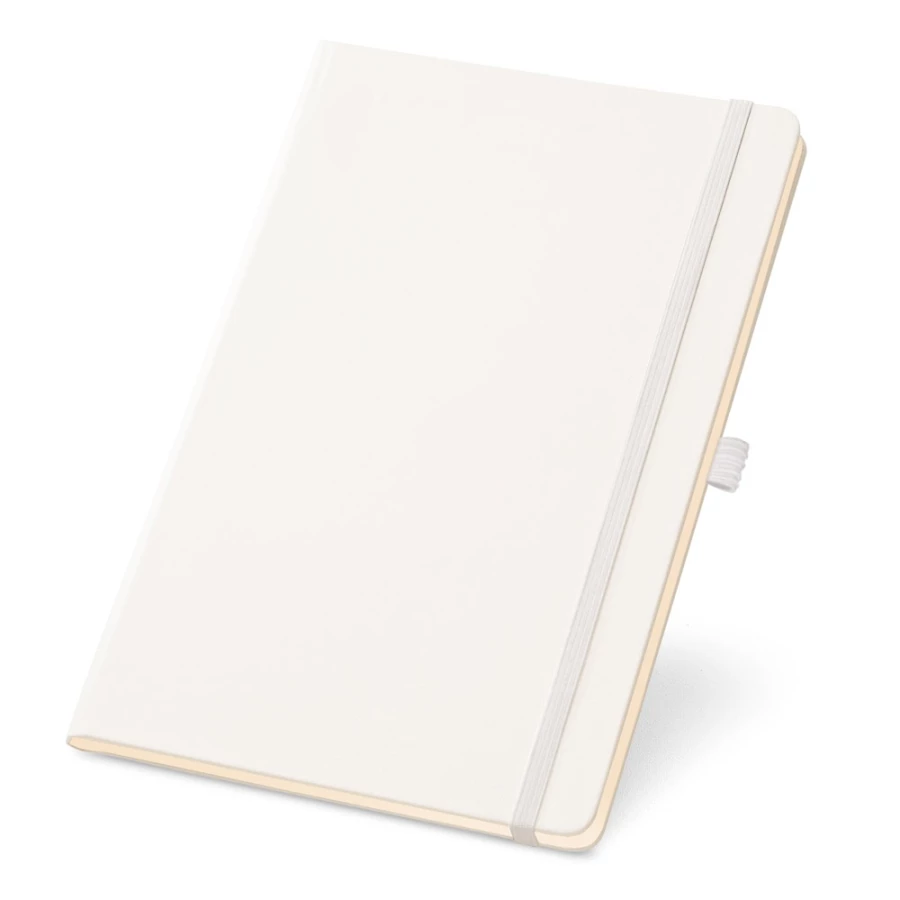 Notatnik A5 ze 160 stronami w linie z papieru z 100% recyklingu kolorze kości słoniowej (70 g/m²). Zawiera twardą okładkę, wewnętrzną kieszeń, pasek oddzielający, uchwyt na długopis (nie w zestawie) i elastyczną opaskę.Kolor 121: bez uchwytu na długopis 137 x 210 mm