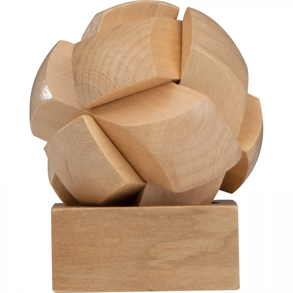 Puzzle przestrzenne wykonane z drewna. Składają się z 6 elementów, które należy połączyć tak, aby stworzyły kulę.