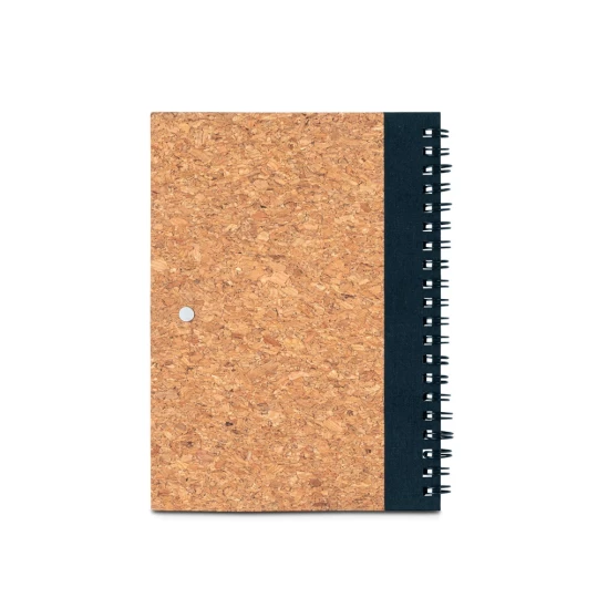 Notatnik B6 z twardą okładką z korka i PET pochodzącego z recyklingu (100% rPET) z 140 gładkimi stronami z papieru z 100% recyklingu (70 g/m²) Zawiera uchwyt na długopis i długopis z włókna pszenicznego i ABS z klipem. Niebieski tusz. Ponieważ produkt jest wykonany z naturalnych materiałów, kolor produktu oraz wynik drukowania mogą się różnić w zależności od produktu. Notes: 130 x 178 mm | Długopis: ø10 x 141 mm