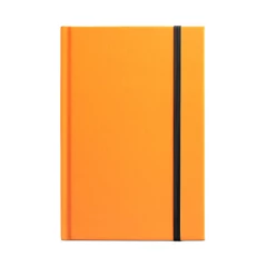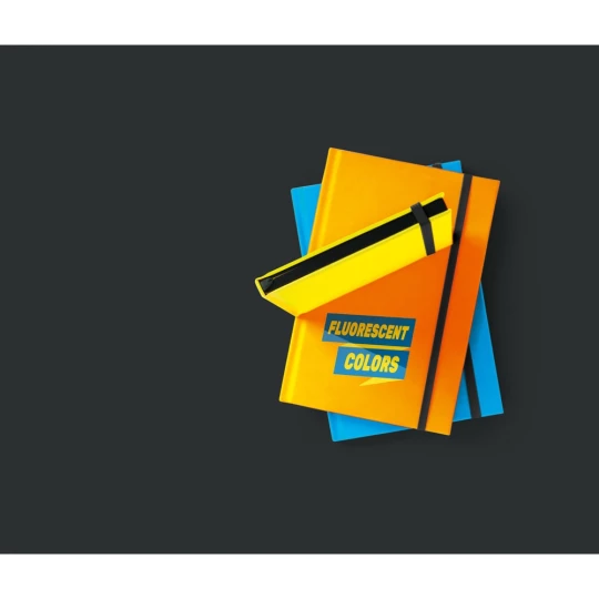 Notes A5 w twardej oprawie, wykonanej z fluorescencyjnego PU. Posiada 192 białe strony (70 g/m²) w linie z czarnymi brzegami, zakładkę ze wstążki i gumkę. 140 x 210 mm