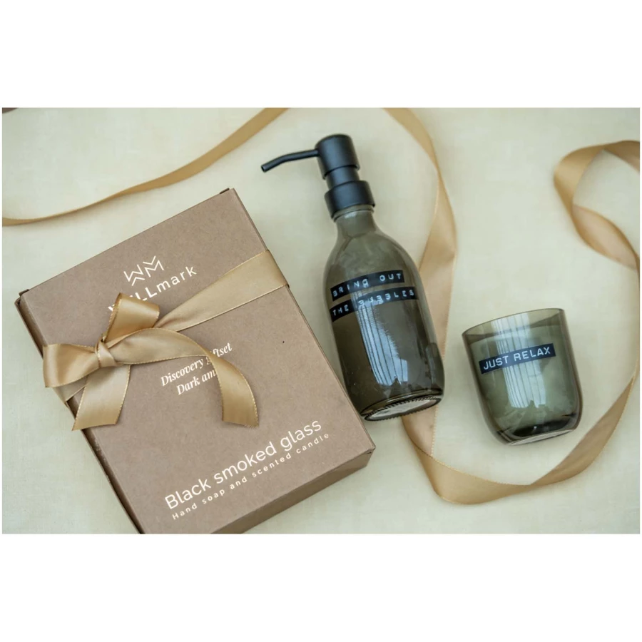 Ten uroczy zestaw składa się z dozownika na mydło do rąk i świecy zapachowej o pięknym zapachu ciemnego bursztynu. Mydło do rąk jest dostarczane w szklanej butelce o pojemności 250 ml z dozownikiem i jest biodegradowalne oraz nie zawiera parabenów, oleju palmowego, PEG, SLS i Sles. Świeca zapachowa (150 g) wykonana jest z wosku rzepakowego i wypala się całkowicie, dzięki czemu słoik nadaje się do wielokrotnego użytku. Wyprodukowano w Holandii.