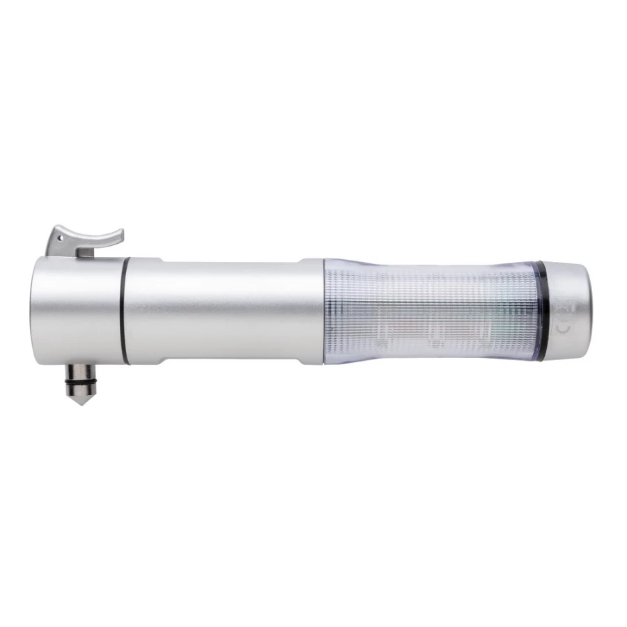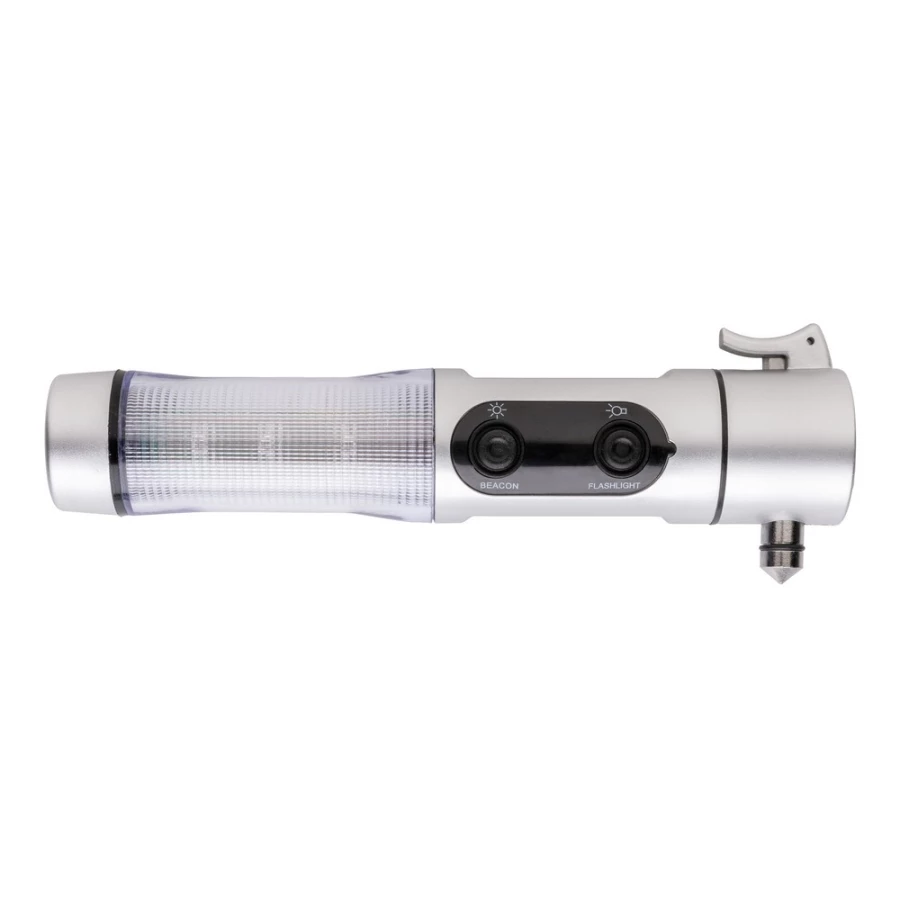 Latarka bezpieczeństwa, obudowa wykonana z ABS, 1 biała dioda LED oraz 9 czerwonych migających na boku, przecinak do pasów, młotek bezpieczeństwa, magnetyczna podstawka do przymocowania do karoserii samochodu, ślad węglowy produktu: 1,29 kg CO2