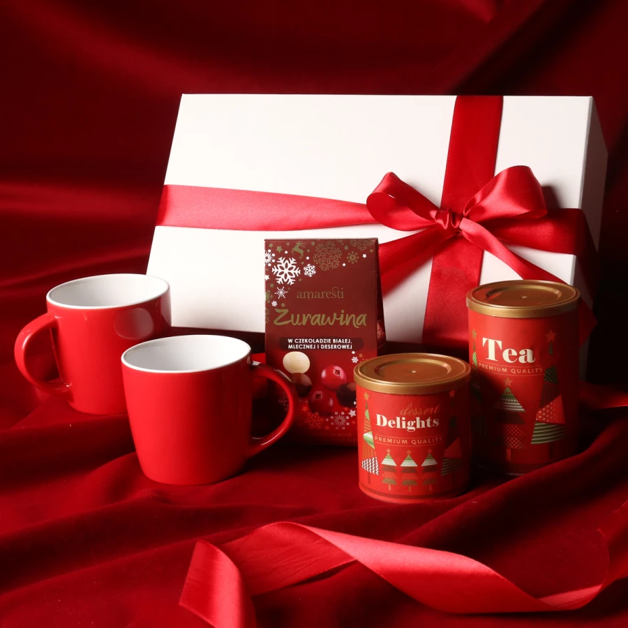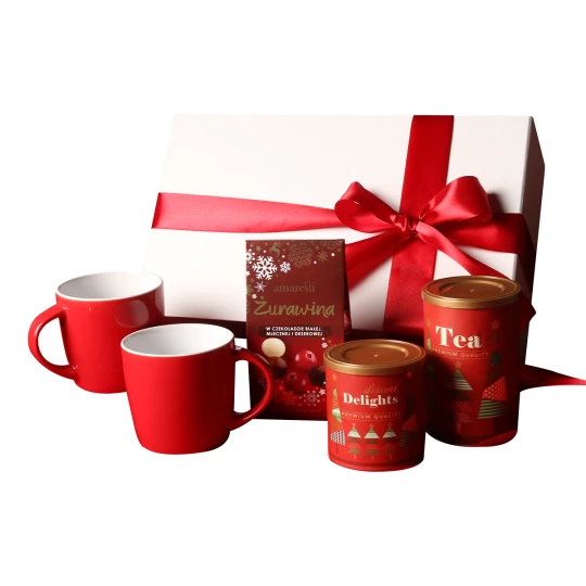 kubek Handy czerwony/biały (2 szt.) z możliwością zdobienia, zielona herbata Sencha z wiśniami, płatkami róży zapakowana w tubę z motywem zimowym, Amaresti Pralines - Żurawina w czekoladzie mlecznej i deserowej, Dessert Delights - Czarna porzeczka w białej czekoladzie, Całość w stylowym, śnieżnobiałym opakowaniu z magnesem.