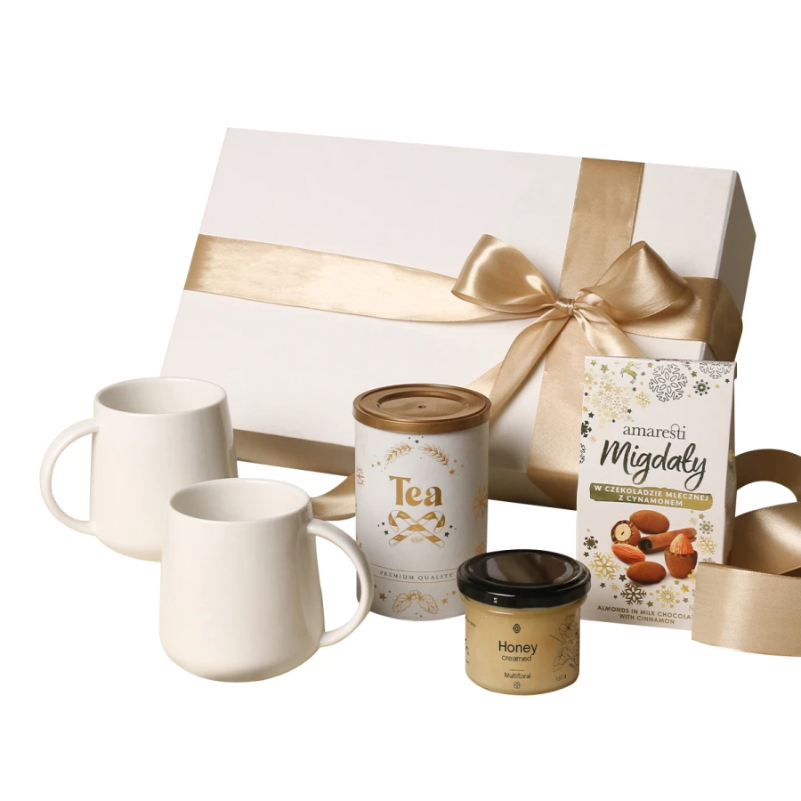 kubek Melody biały (2 szt.) z możliwością zdobienia, zielona herbata Sencha z wiśniami, płatkami róży zapakowana w tubę z motywem zimowym, Amaresti Pralines - Migdały w czekoladzie z cynamonem, Miód kremowany wielokwiatowy. Całość w stylowym, śnieżnobiałym opakowaniu z magnesem.