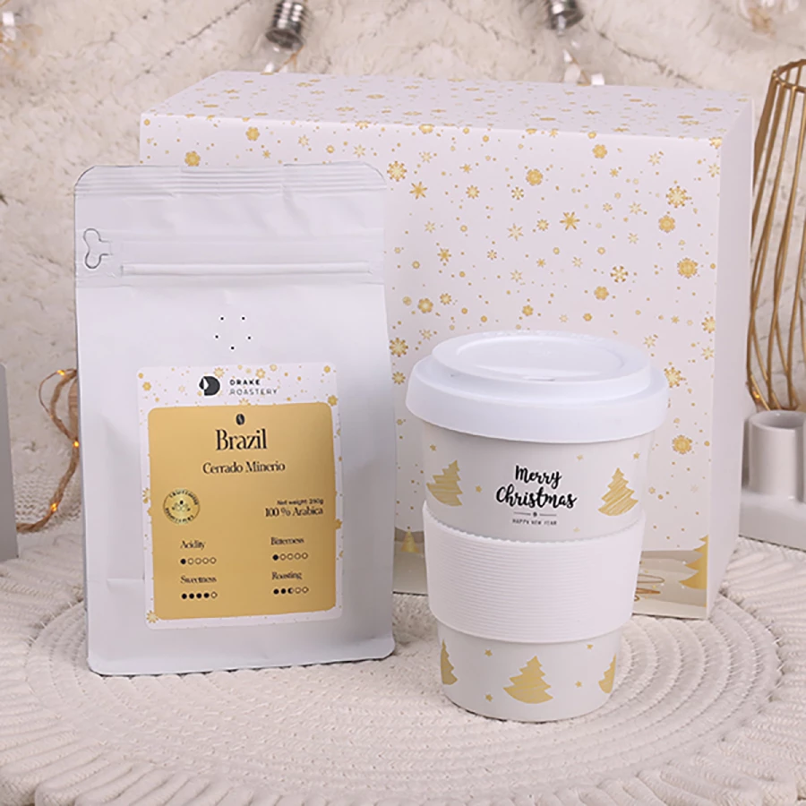 Mobilny kubek Coffee 2 Go z dedykowaną przykrywką i opaską 45mm chroniącą dłonie przed przegrzaniem, dostępnymi w wielu wersjach kolorystycznych, w towarzystwie pełnej aromatu kraftowej kawy ziarnistej Arabica Brazil Cerrado Mineiro 250g. PREZENTOWANE ZDOBIENIE MA CHARAKTER POGLĄDOWY I NIE JEST WLICZONE W CENĘ PRODUKTU. ZESTAW DOSTĘPNY W DEDYKOWANYM OPAKOWANIU SNOWY Z WYBRANĄ OPCJĄ ZDOBIENIA.