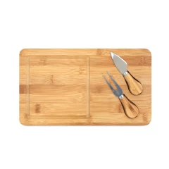 Bambusowa deska do serów z 2 przyborami wykonanymi z bambusa i stali nierdzewnej. Dostarczany w pudełku upominkowym z papieru kraft. Ponieważ produkt jest wykonany z naturalnych materiałów, kolor produktu oraz wynik drukowania mogą się różnić w zależności od produktu. 310 x 180 x 15 mm | Pudełko: 316 x 186 x 25 mm