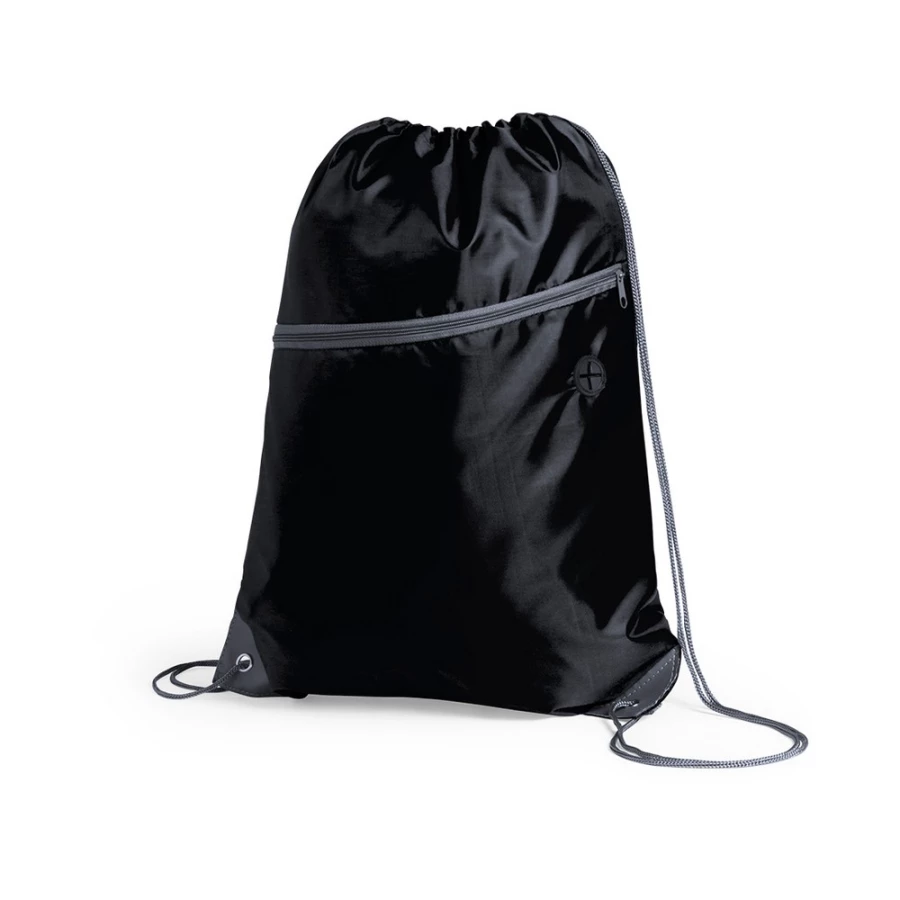 Worek ze sznurkiem umożliwiającym noszenie na plecach, wzmocnione narożniki zmniejszają ryzyko rozdarcia materiału, pomieści drobne zakupy lub strój sportowy na siłownię, posiada przednią kieszeń zamykaną na zamek błyskawiczny oraz otwór na kabel od słuchawek lub power banku (nie są dołączone), produkt wykonany z poliestru 210D