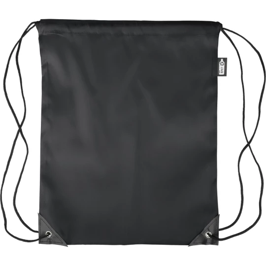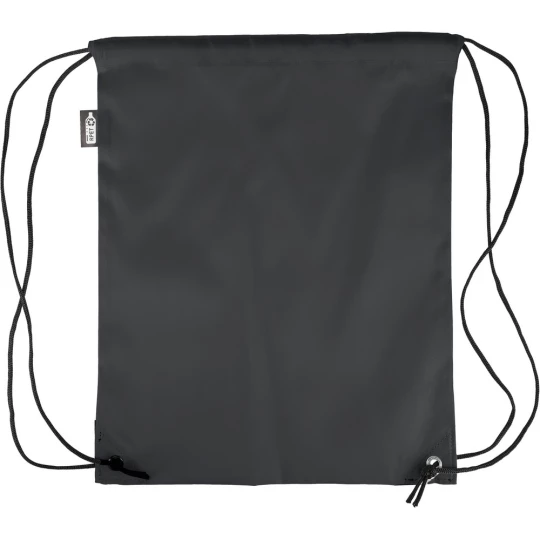 Worek ze sznurkiem, czarny nylonowy sznurek po obu stronach, zamknięcie na ściągacz, pojemność: 5L, maksymalne obciążenie: 7 kg, ikona RPET na metce, produkt wykonany z poliestru RPET 210D z dwoma czarnymi narożnikami z PU z przodu i wewnętrznymi szwami