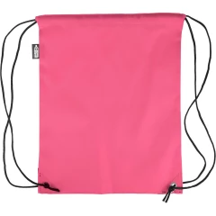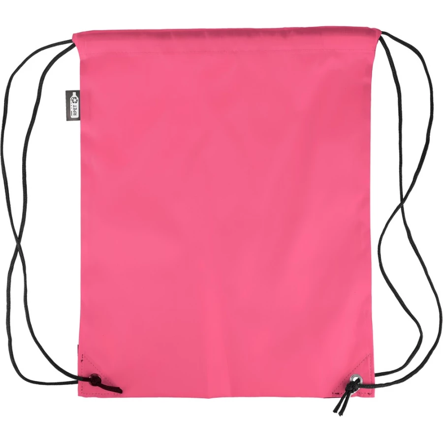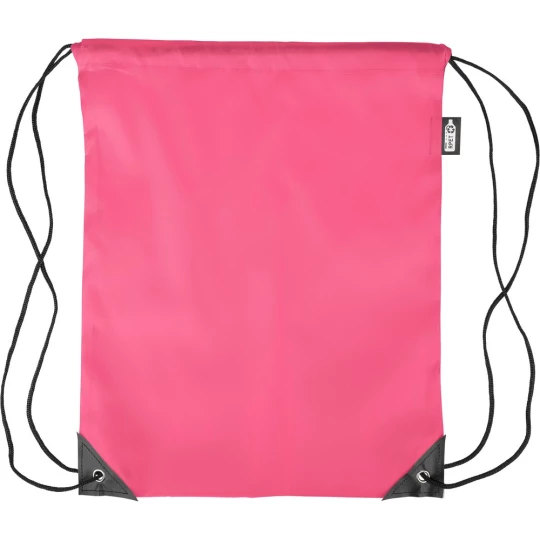 Worek ze sznurkiem, czarny nylonowy sznurek po obu stronach, zamknięcie na ściągacz, pojemność: 5L, maksymalne obciążenie: 7 kg, ikona RPET na metce, produkt wykonany z poliestru RPET 210D z dwoma czarnymi narożnikami z PU z przodu i wewnętrznymi szwami
