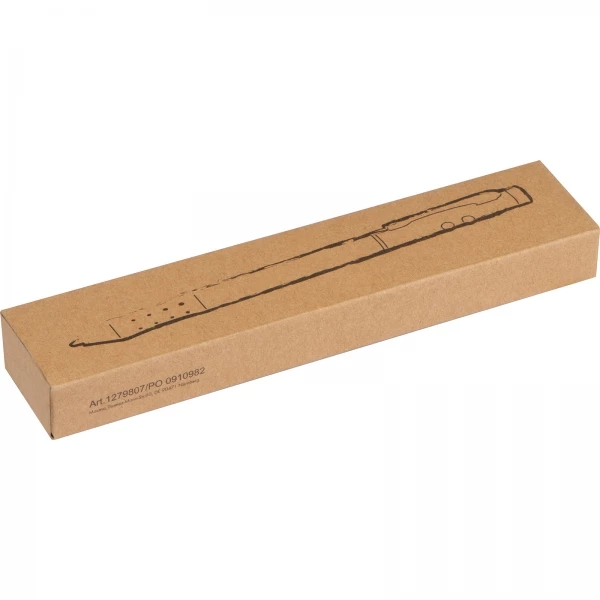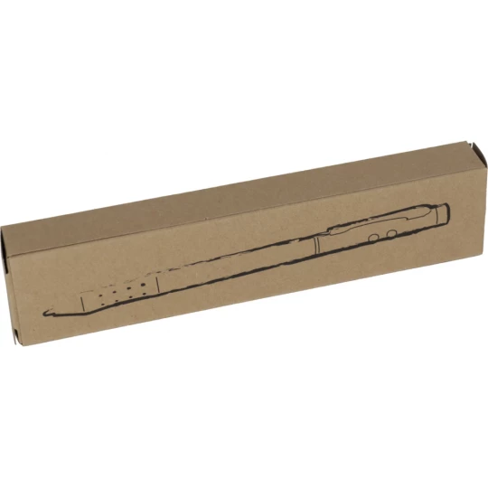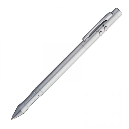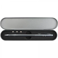 Wskaźnik laserowy z długopisem piszącym na niebiesko lub czerwono (przekręcając można wybrać kolor wkładu) oraz lampką LED. Wskaźnik zapakowany jest w eleganckie, metalowe etui. Logo możemy umieścić zarówno na etui, jak i korpusie długopisu (nadruk kolorowy tylko na etui). Produkt zawiera baterie.