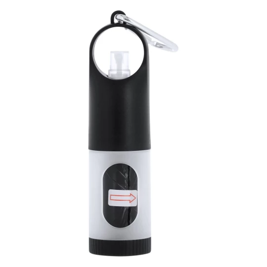 Zasobnik z 15 woreczkami na psie odchody, posiada karabińczyk umożliwiający przypinanie oraz żel do rąk 30 ml, roztwór o 62-65% zawartości alkoholu, produkt wykonany z PP