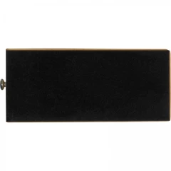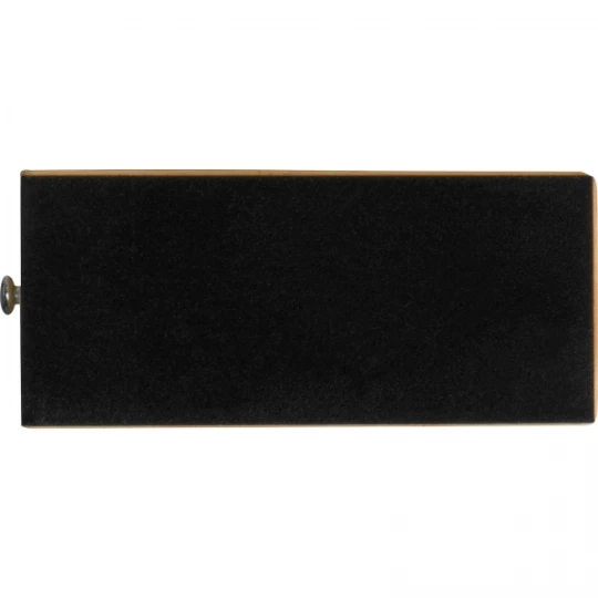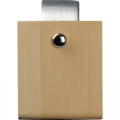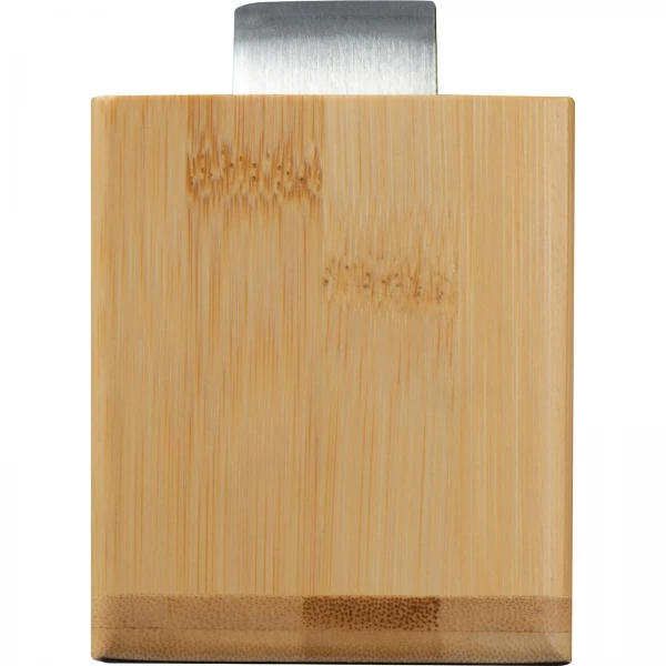 Aluminiowy zegar obrotowy umieszczony na drewnianej podstawce, wyposażonej w pojemnik na artykuły piśmiennicze.