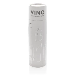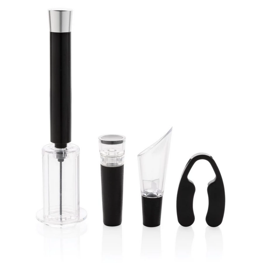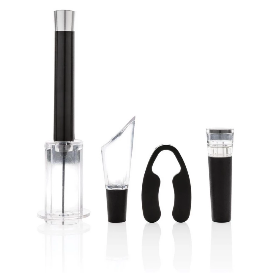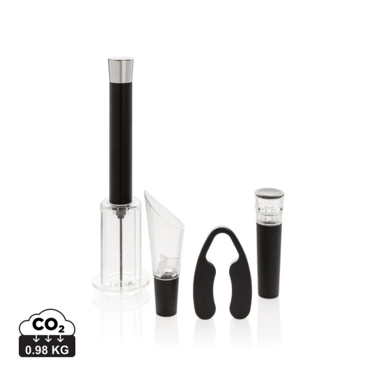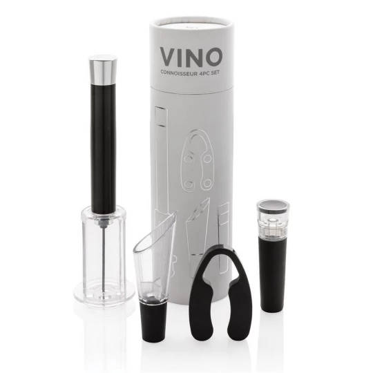 Zestaw akcesoriów do wina 4 el.: ciśnieniowy korkociąg, nóż do folii, korek z pompką próżniową, nalewak z aeratorem, w eleganckiej tubie upominkowej, ślad węglowy produktu: 0,98 kg CO2