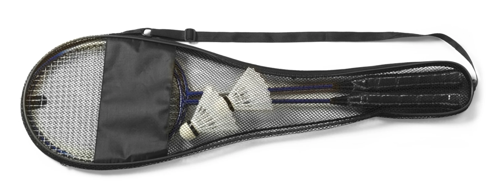 Zestaw do badmintona, 2 rakiety ze stalowymi ramami i plastikowymi rączkami, 2 lotki, czarny pokrowiec z paskiem na ramię