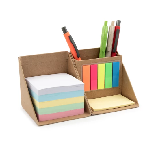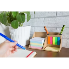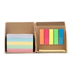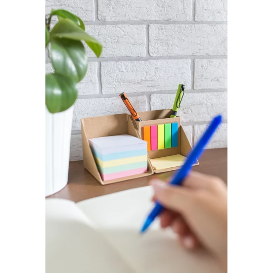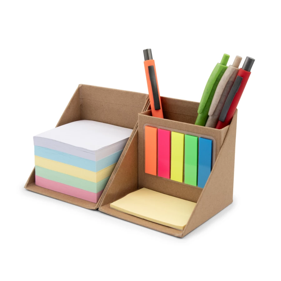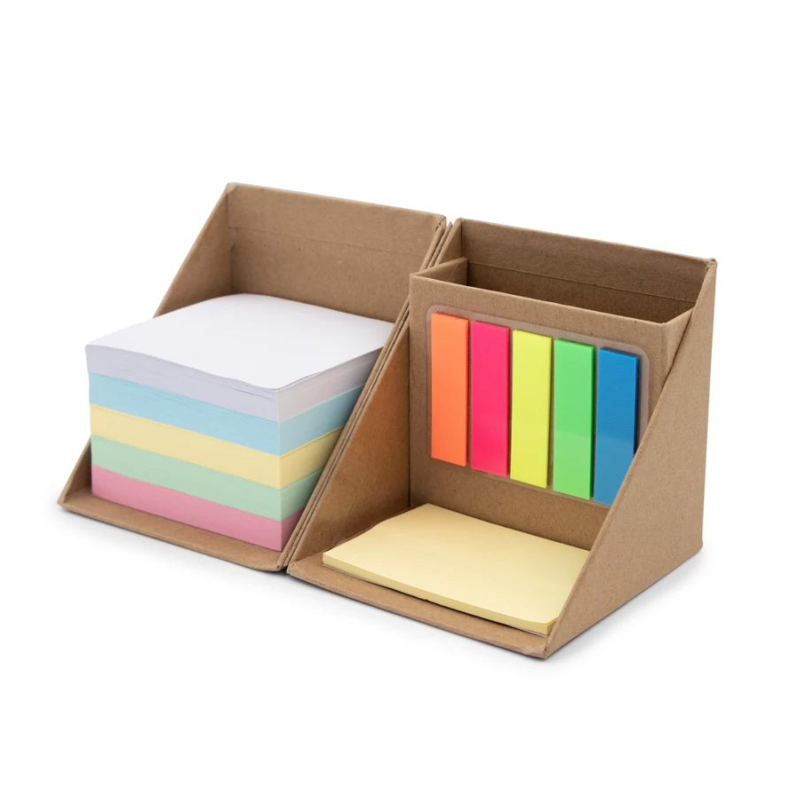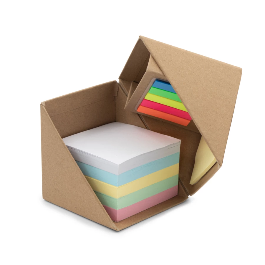 Zestaw do notatek w kształcie kostki, składana konstrukcja pozwala zaoszczędzić miejsce na biurku oraz może ułatwić przenoszenie, zestaw posiada 500 pustych kartek w 5 kolorach, 100 mini karteczek samoprzylepnych (5 kolorów po 20 szt.) oraz 50 większych żółtych karteczek samoprzylepnych, przegroda wewnętrzna może służyć jako pojemnik na przybory do pisania (nie są dołączone), produkt wykonany z kartonu oraz papieru