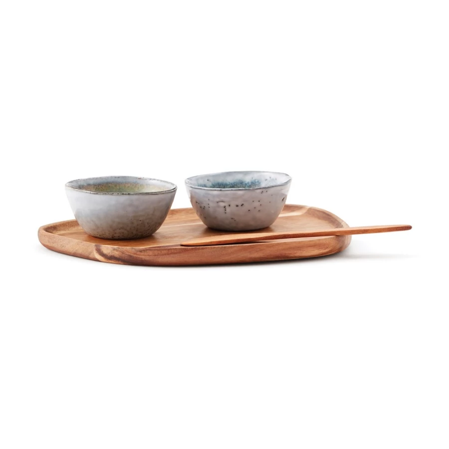 Zestaw do serwowania 3 el., w komplecie 2 miski wykonane z naturalnej kamionki oraz drewniany talerz, można myć w zmywarce i używać w kuchence mikrofalowej