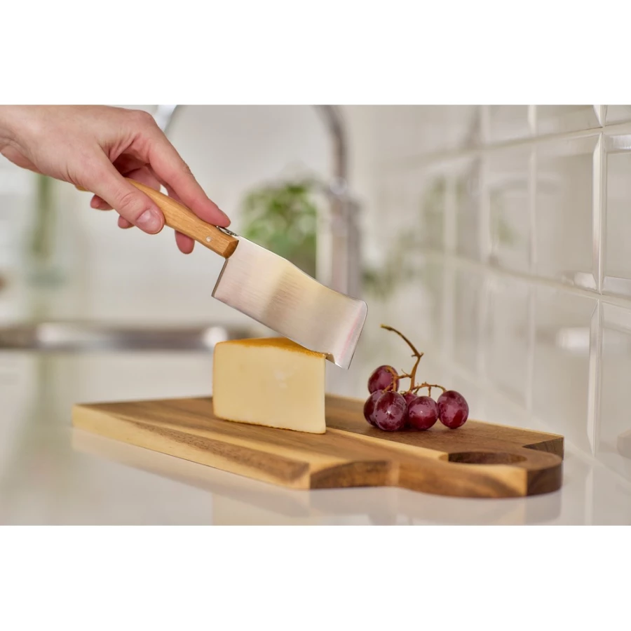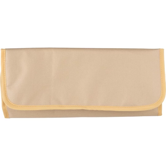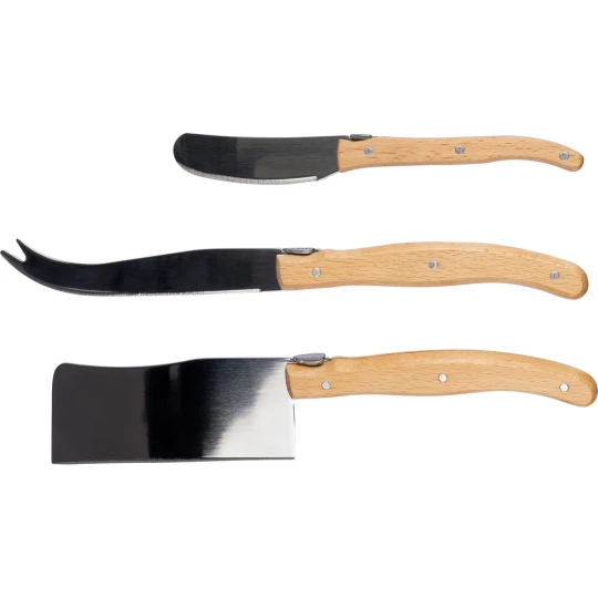 Zestaw do wędlin w etui zamykanym na rzep, zawierający trzy noże ze stali nierdzewnej z drewnianymi uchwytami, wewnątrz znajduje się ikona RPET na metce, bezpieczny w kontakcie z żywnością, indywidualnie pakowany w brązowe kartonowe pudełko, produkt wykonany z RPET