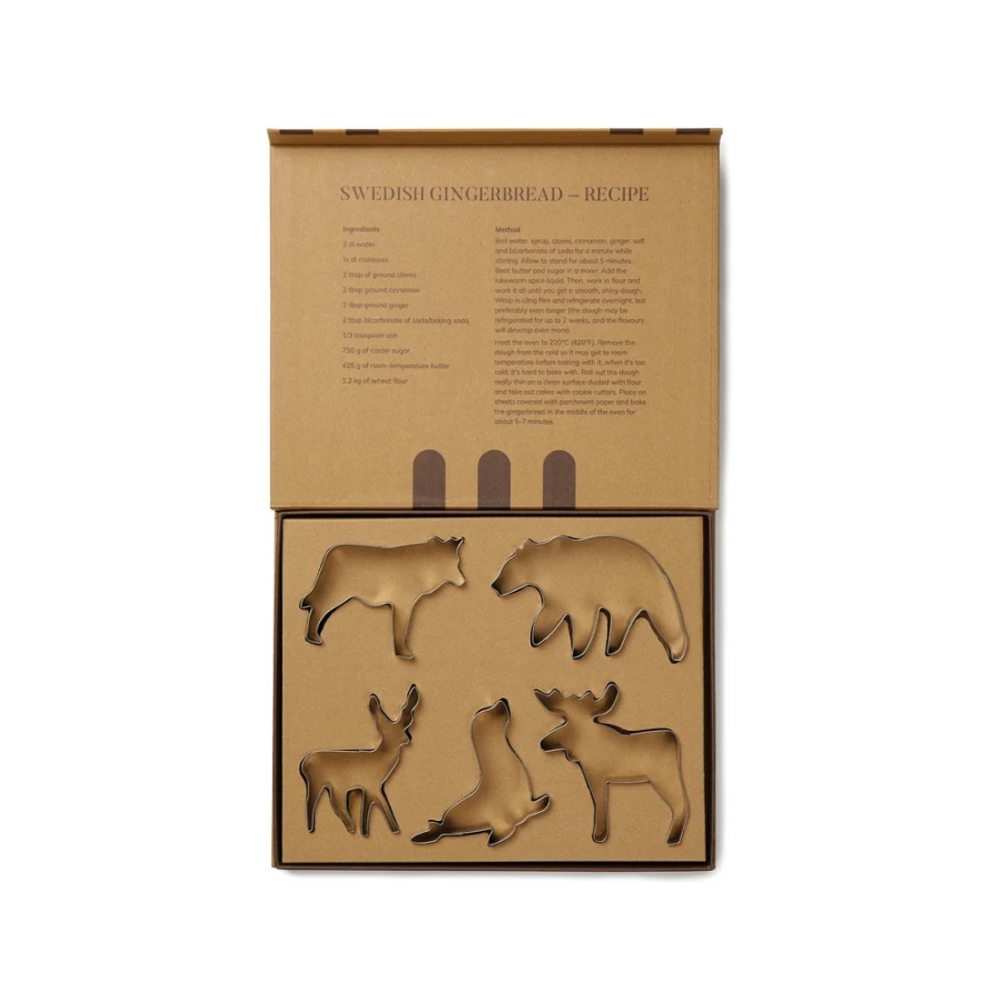 Zestaw foremek do ciastek, 5 różnych kształtów, wykonane ze stali nierdzewnej, łatwe w czyszczeniu, w pudełku upominkowym, wewnątrz pudełka przepis na szwedzkie ciasteczka imbirowe