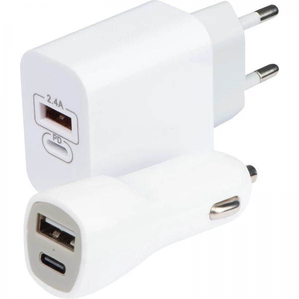Zestaw z PU, plastiku i metalu, zawierający ładowarkę samochodową oraz tradycyjną ładowarkę podłączaną do gniazdka (zestaw nie zawiera kabla ładującego). Obie ładowarki posiadają złącza: USB oraz USB typu C. Zestaw zapakowany w zamykane na zamek etui, które posiada w środku praktyczną kieszonkę na drobiazgi.