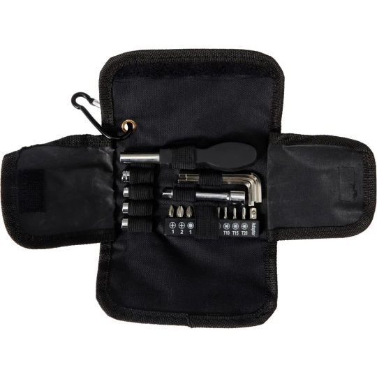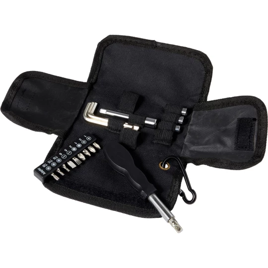 Zestaw narzędzi, 20 el., w zestawie 1 śrubokręt, 3 klucze imbusowe, 4 nakładki, 10 bitów, 1 końcówka przedłużająca, w pokrowcu na rzep z karabińczykiem