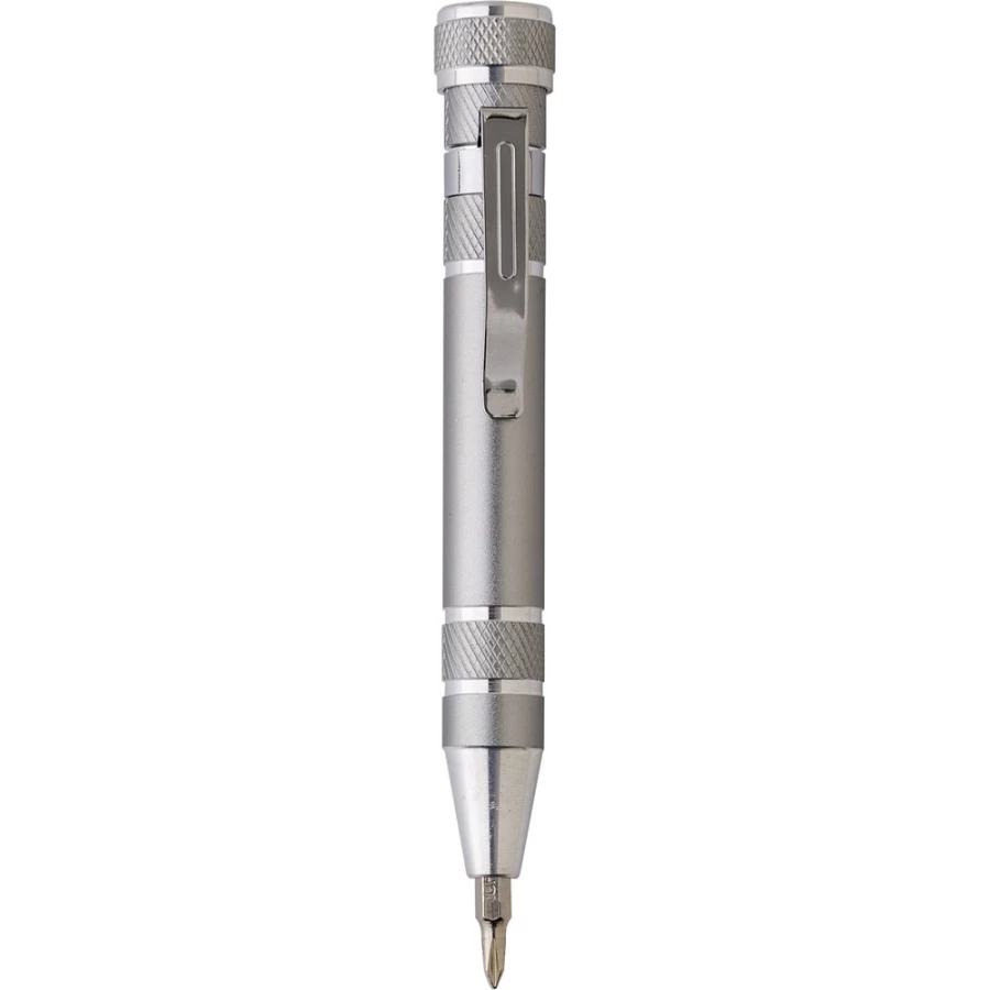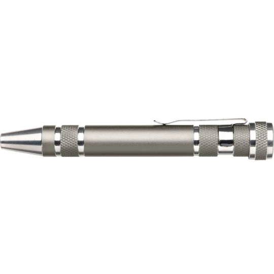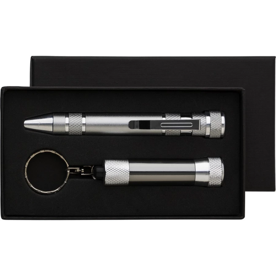 Zestaw w pudełku: śrubokręt z 8 wymiennymi końcówkami i latarka kieszonkowa 3 LED na breloku