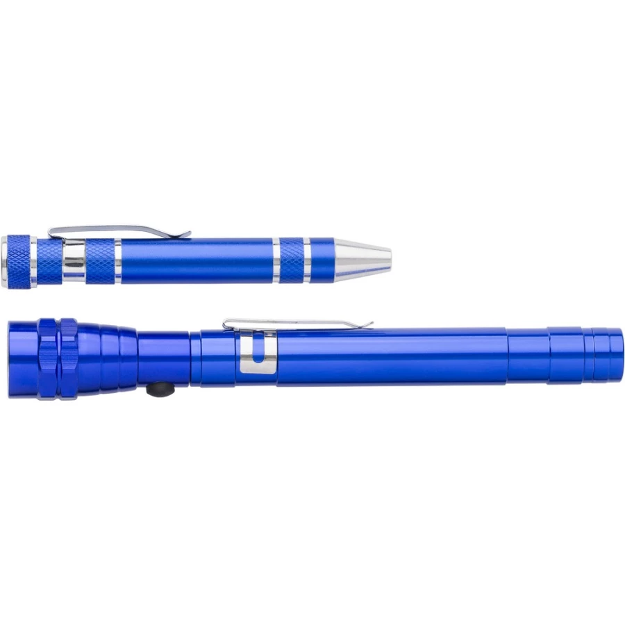 Zestaw narzędzi w pudełku, teleskopowa latarka 3 LED oraz śrubokręt w kształcie długopisu z 4 płaskimi i 4 krzyżakowymi końcówkami