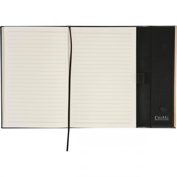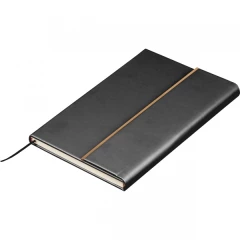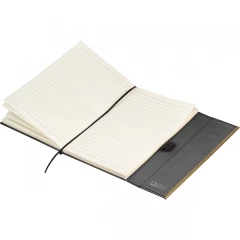 Zestaw, składający się z notesu z 96 kartkami w linie, w oprawie ze skóry pochodzącej z recyklingu i dopasowanego kolorystycznie długopisu.