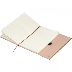 Zestaw, składający się z notesu z 96 kartkami w linie, w oprawie ze skóry pochodzącej z recyklingu i dopasowanego kolorystycznie długopisu.