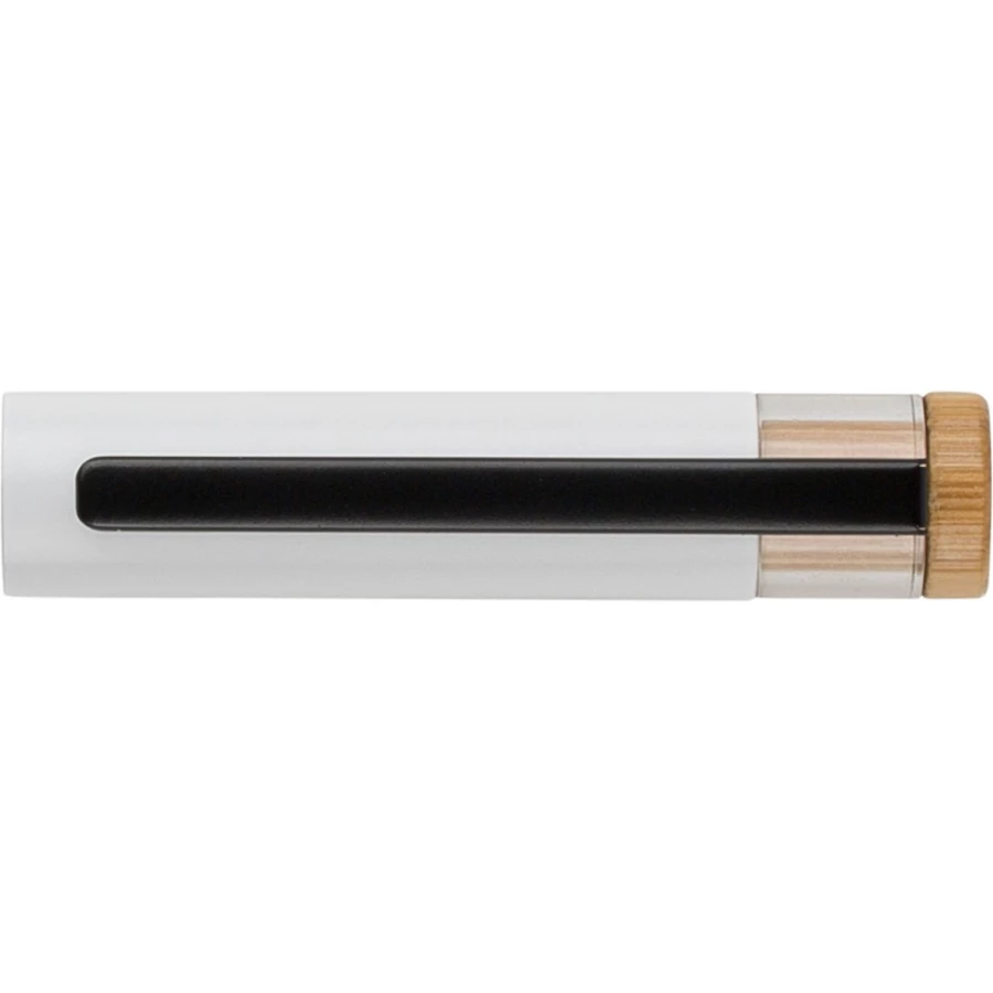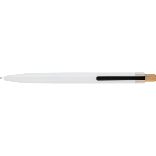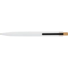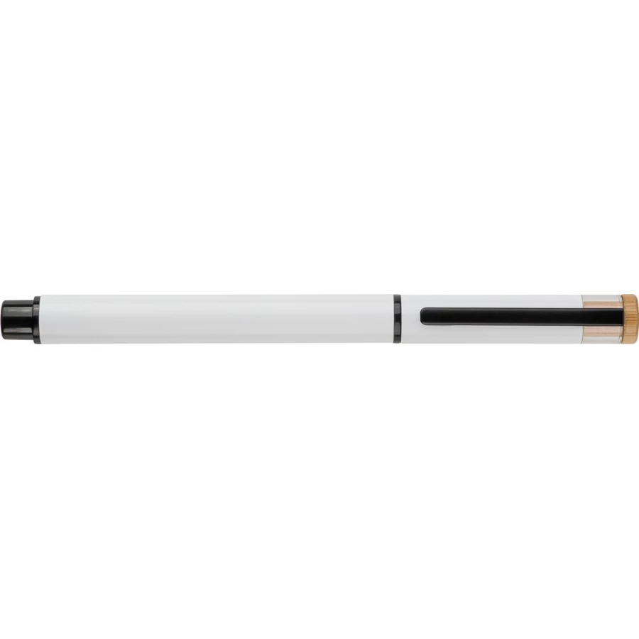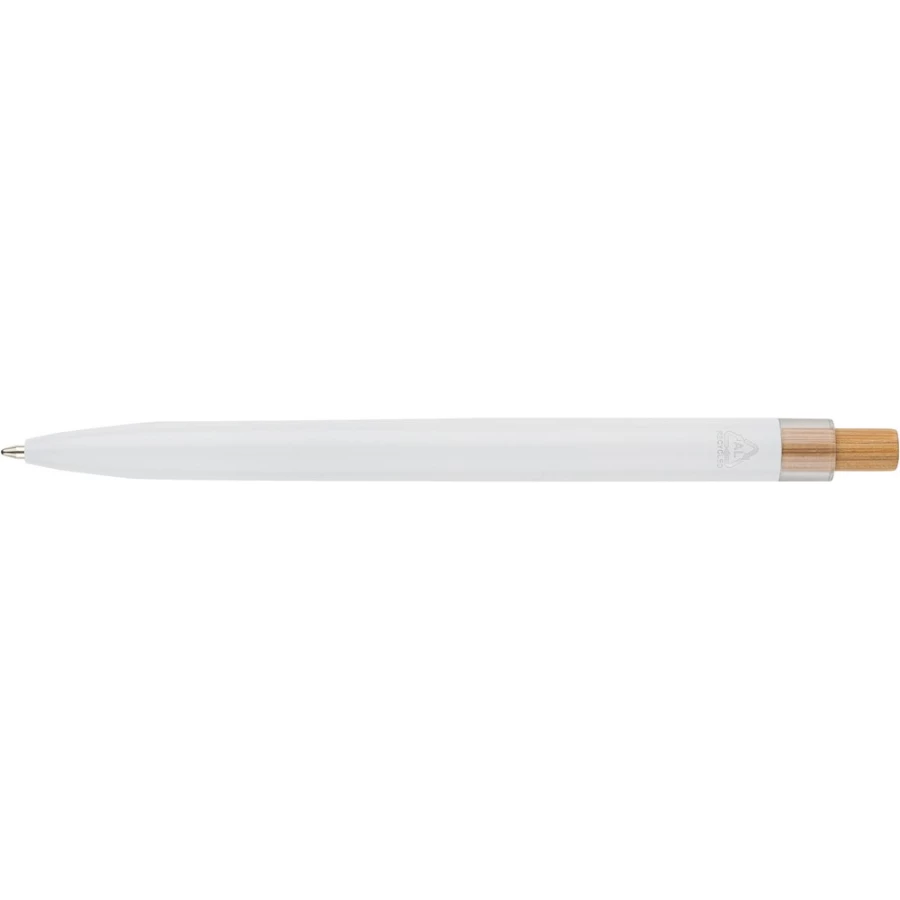 Zestaw piśmienniczy, w którego w skład wchodzi: długopis z bambusowym przyciskiem, ikoną recyklingu na produkcie, metalowym klipsem, tusz w niebieskim kolorze, wystarczający na ok. 700 m pisania, pióro kulkowe z pokrywką, metalowym klipsem, ikoną recyklingu na produkcie, wkład w niebieskim kolorze, wystarczający na ok. 500 m pisania, zapakowany w kolorowe pudełko upominkowe z recyklingu, produkt wykonany z aluminium z recyklingu, RPET i metalu