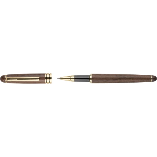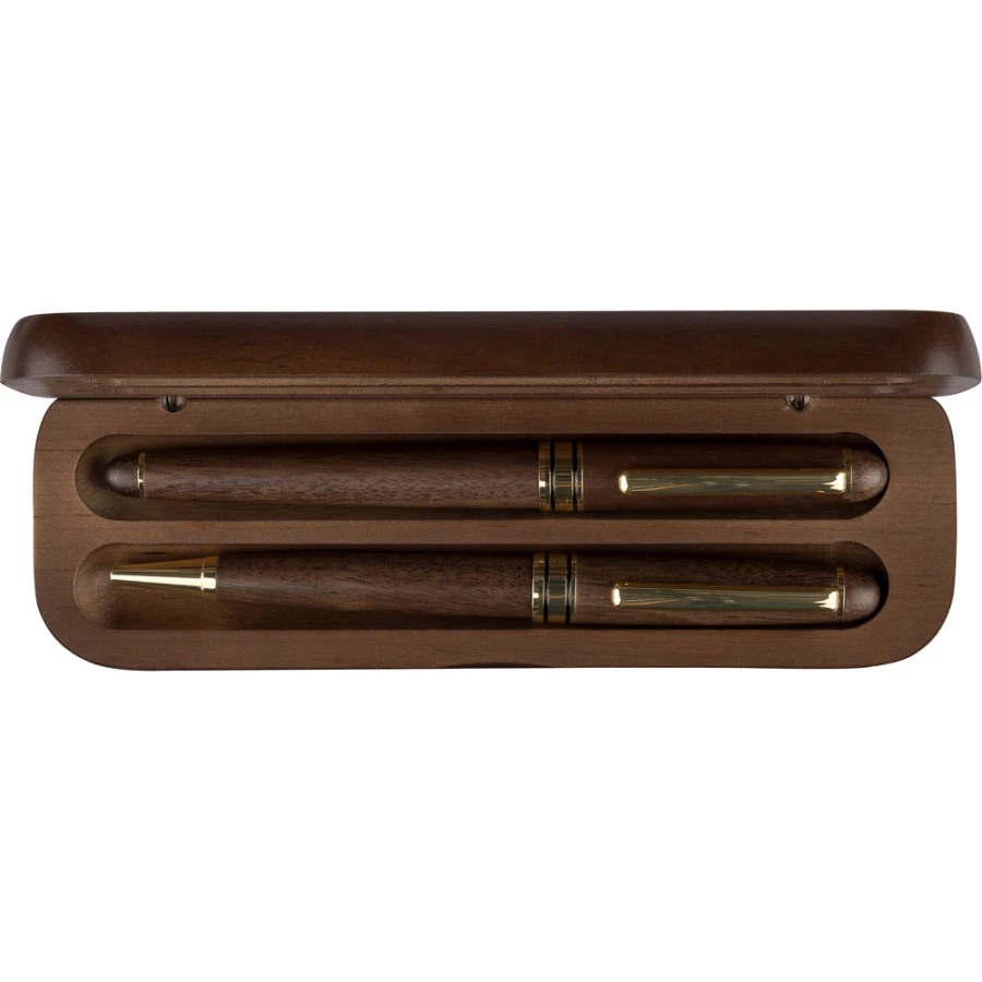 Zestaw piśmienniczy, długopis i pióro kulkowe, wkład w niebieskim kolorze wystarcza na ok. 1000 m pisania dla długopisu, ok. 400 m pisania dla pióra kulkowego, zapakowany pojedynczo w brązowy kartonik, produkt wykonany z metalu