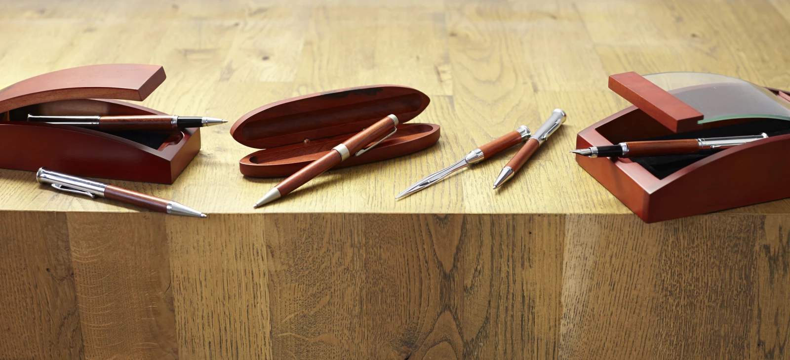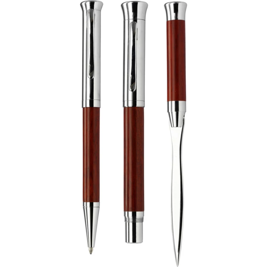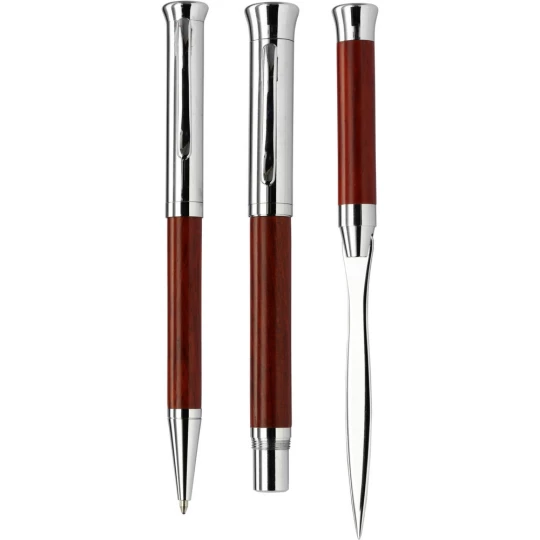 Zestaw piśmienniczy w drewnianym etui, długopis przekręcany, pióro wieczne i nóż do otwierania listów