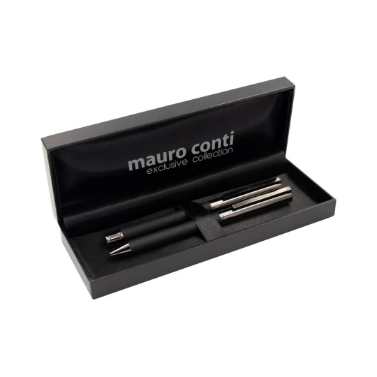 Zestaw piśmienniczy Mauro Conti, długopis i pióro kulkowe z czarnym trzonem i błyszczącymi elementami, w ozdobnym pudełku