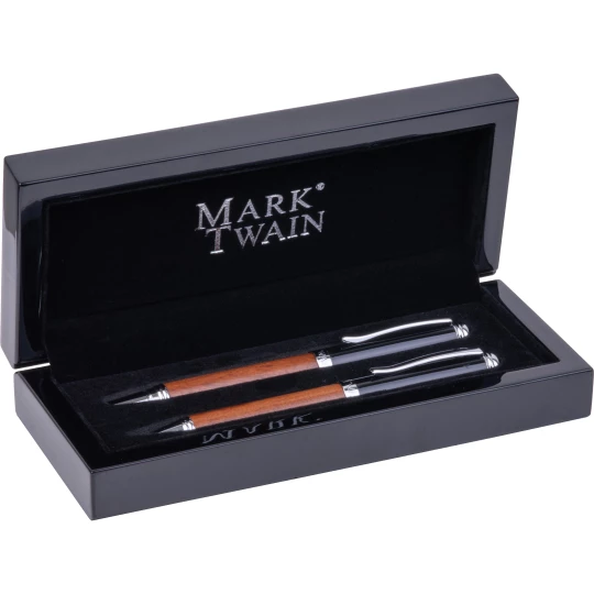 Zestaw do pisania Mark Twain składający się z długopisu (zasięg pisania do 1200 m) oraz pióra kulkowego (zasięg pisania do 400 m), wykonanych z drewna i stali nierdzewnej, piszących na niebiesko. Całość zapakowana w eleganckie, czarne etui.