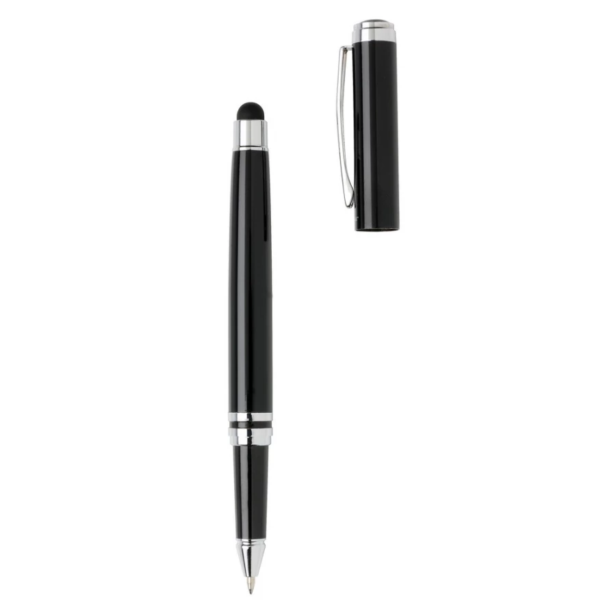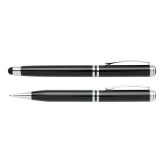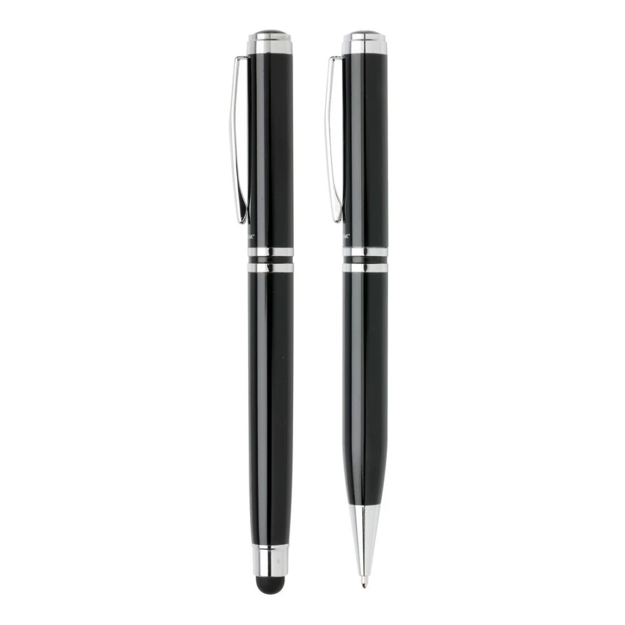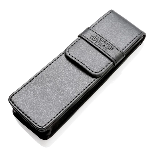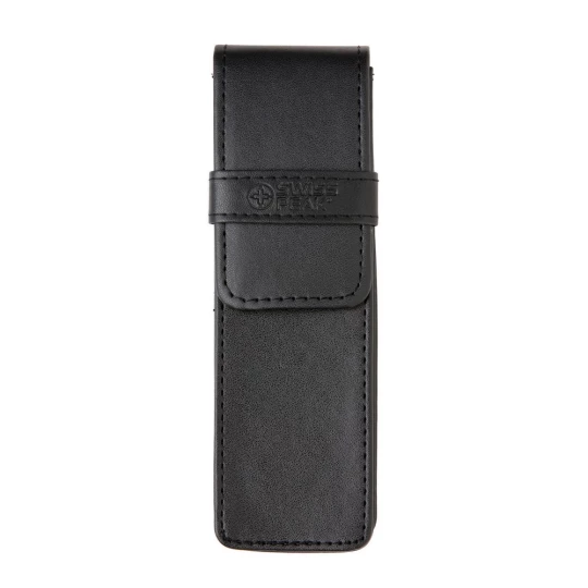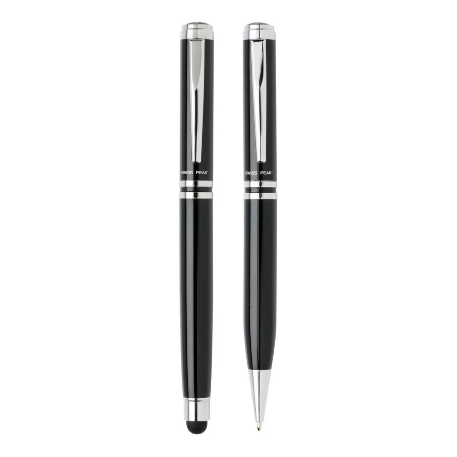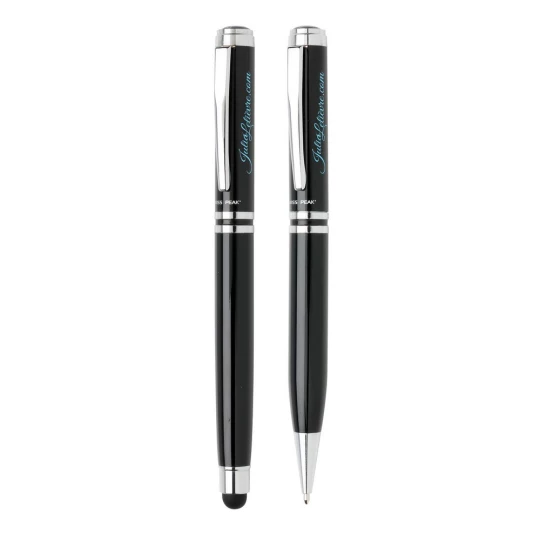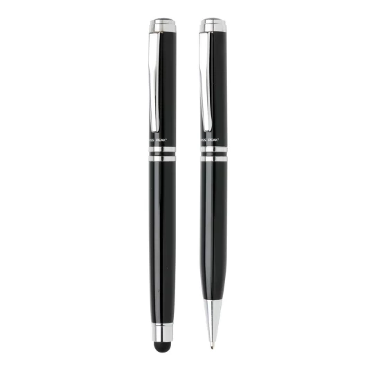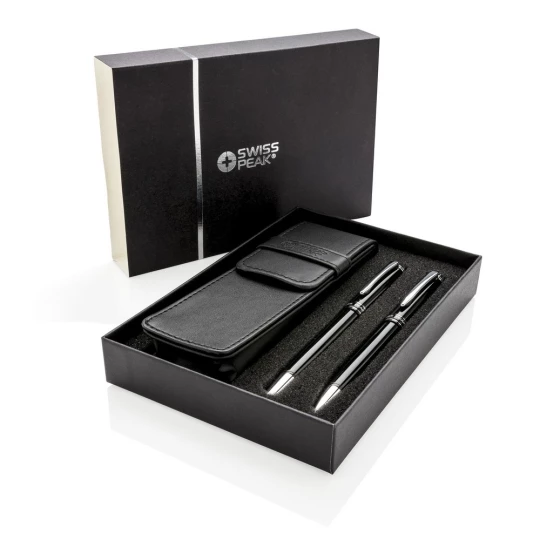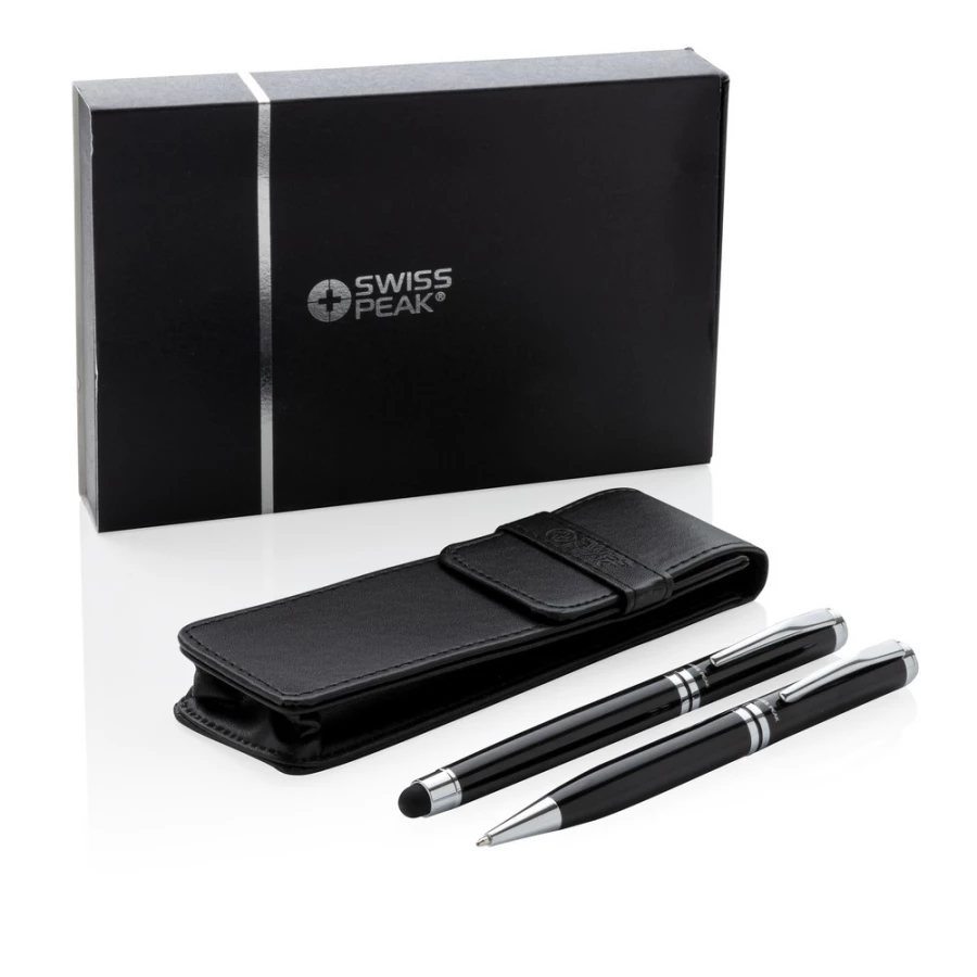 Ekskluzywny zestaw piśmienny, wykonane z mosiądzu pióro kulkowe z touch penem oraz długopis z logotypem Swiss Peak, niebieski wkład, pokrowiec PU oraz pudełko podarunkowe w komplecie, ślad węglowy produktu: 0,54 kg CO2