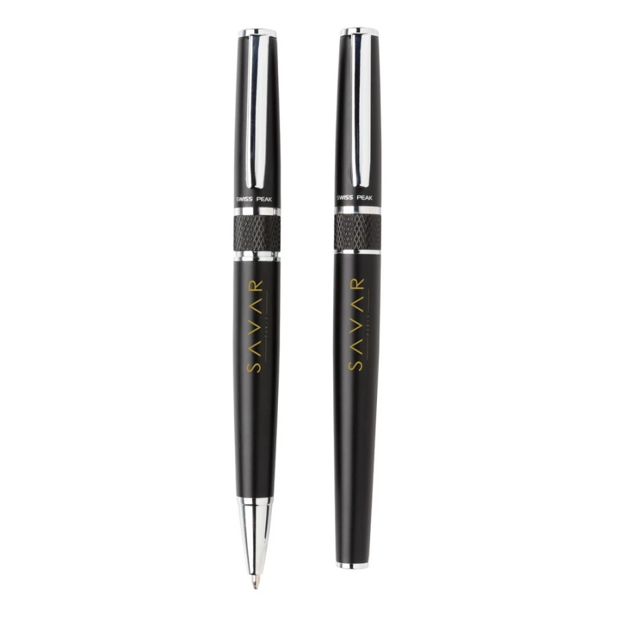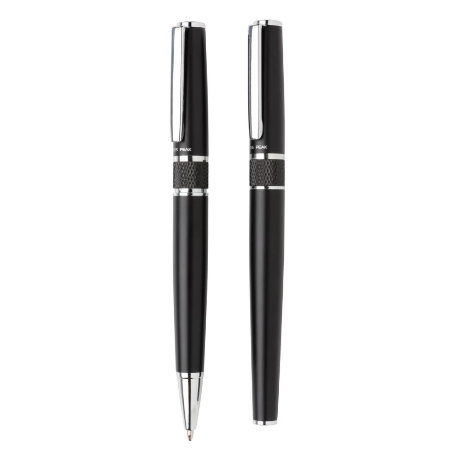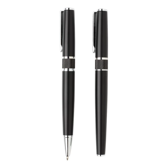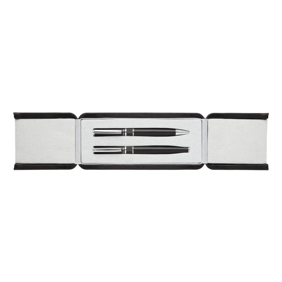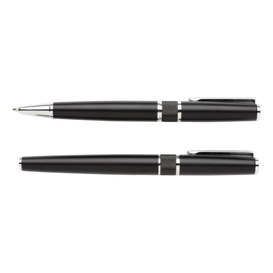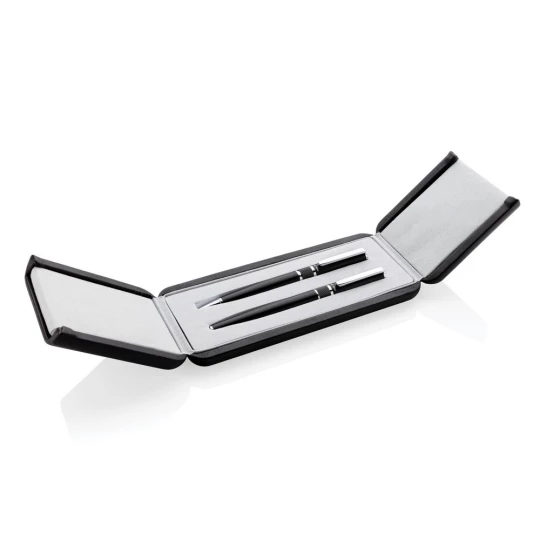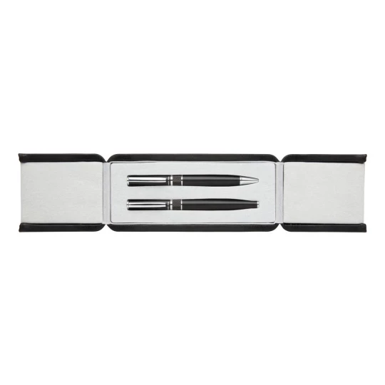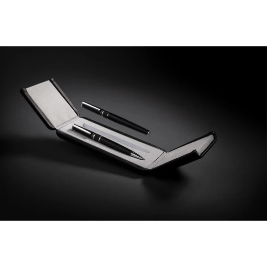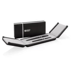 Ekskluzywny zestaw piśmienny, długopis i pióro kulkowe, długopis posiada wkład Dokumental® w kolorze niebieskim, długość pisania ok. 1200 m, kulka TC zapewnia wygodne pisanie, pióro kulkowe posiada wkład Dokumental® w kolorze niebieskim, długość pisania ok. 1200 m, w ozdobnym etui z wytłoczonym logotypem, ślad węglowy produktu: 1,05 kg CO2