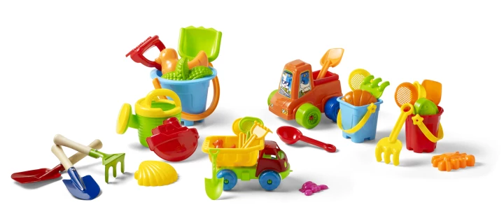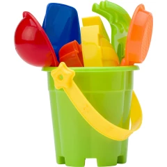 Wiaderko plażowe w 4 różnych kolorach i kształtach - 2 okrągłe, 1 kwadrat, 1 ośmiobok, wewnątrz znajdują się: łopatka, grabki, sitko, szufelka i 2 foremki do piasku (krab i ryba), mix 4 wzorów