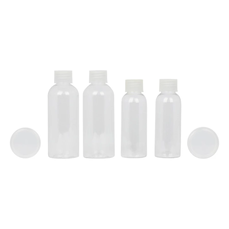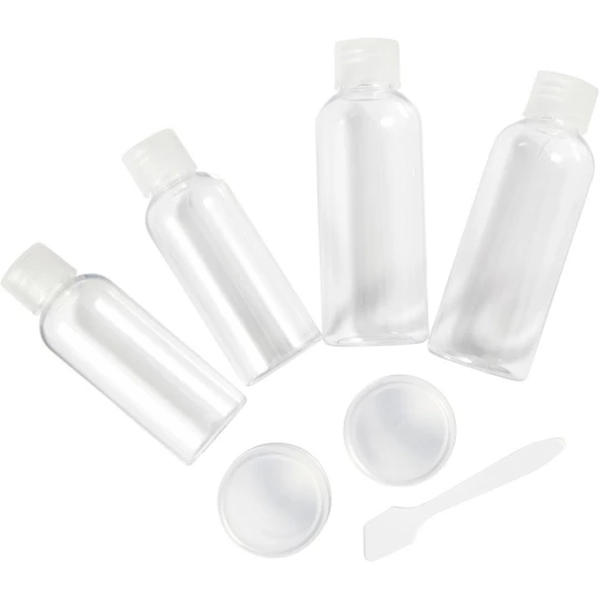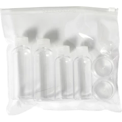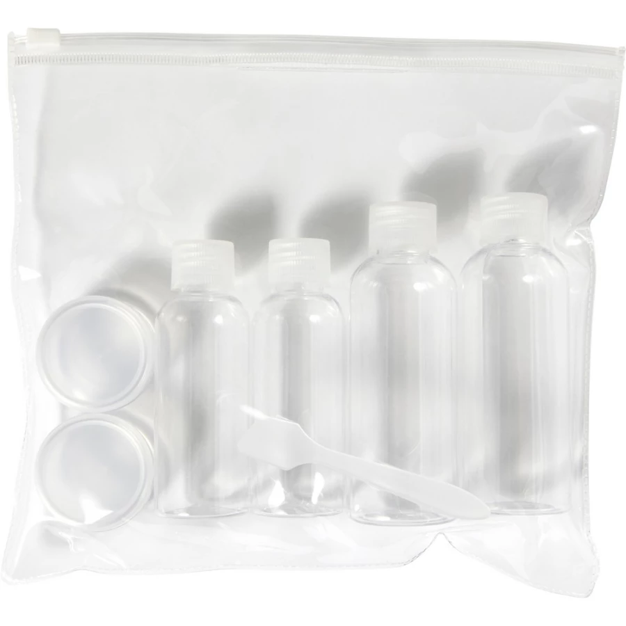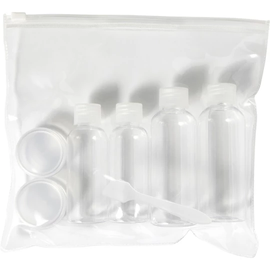 Zestaw podróżny w przezroczystym opakowaniu, 2 butelki 100 ml, 2 butelki 50 ml, 2 pojemniki 10 ml, 1 łopatka