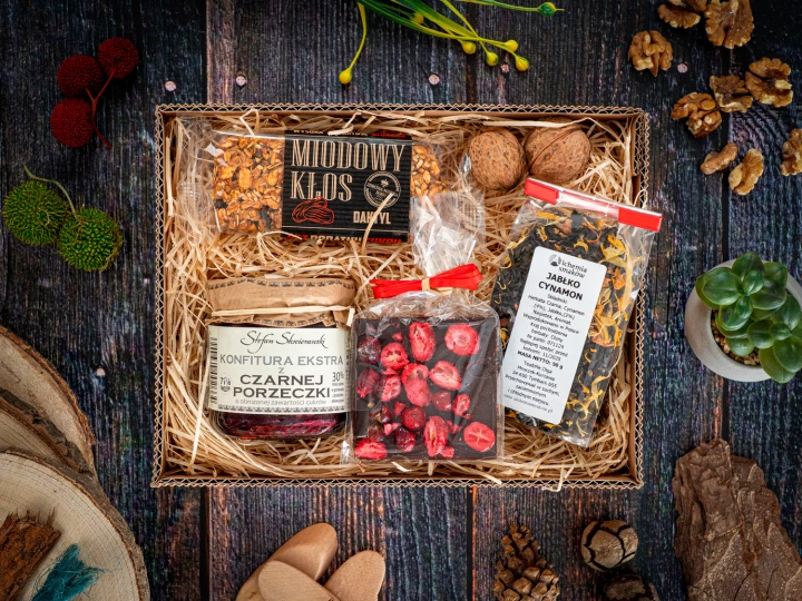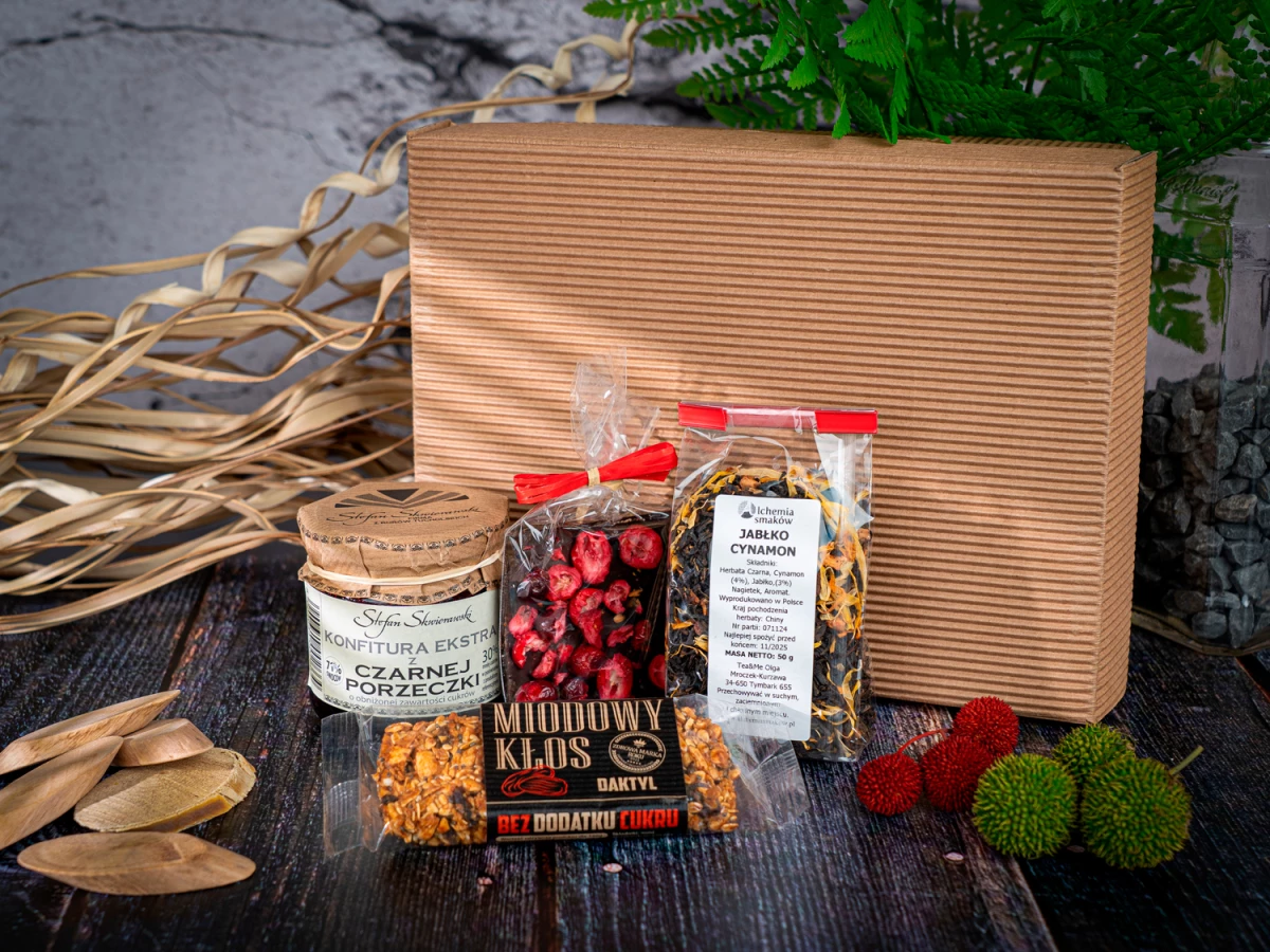 W przypadku braku dostępności produktów z oferty zastrzegamy sobie prawo do zamiany produktów na równowartościowe; zawsze po wcześniejszej akceptacji przez Klienta. Zestaw prezentowy Chwila Relaksu to elegancki i smakowity upominek, idealny na chwilę przyjemności. Zawiera mleczną lub ciemną czekoladkę z żurawiną (20 g), miodowy batonik Kłos z daktylem (45 g), aromatyczną herbatę jabłko-cynamon (50 g) oraz konfiturę extra z czarnej porzeczki (200 g). Całość zapakowana jest w eleganckie opakowanie z wypełnieniem i rafią. To doskonały prezent, który zachwyci smakiem i stylem!