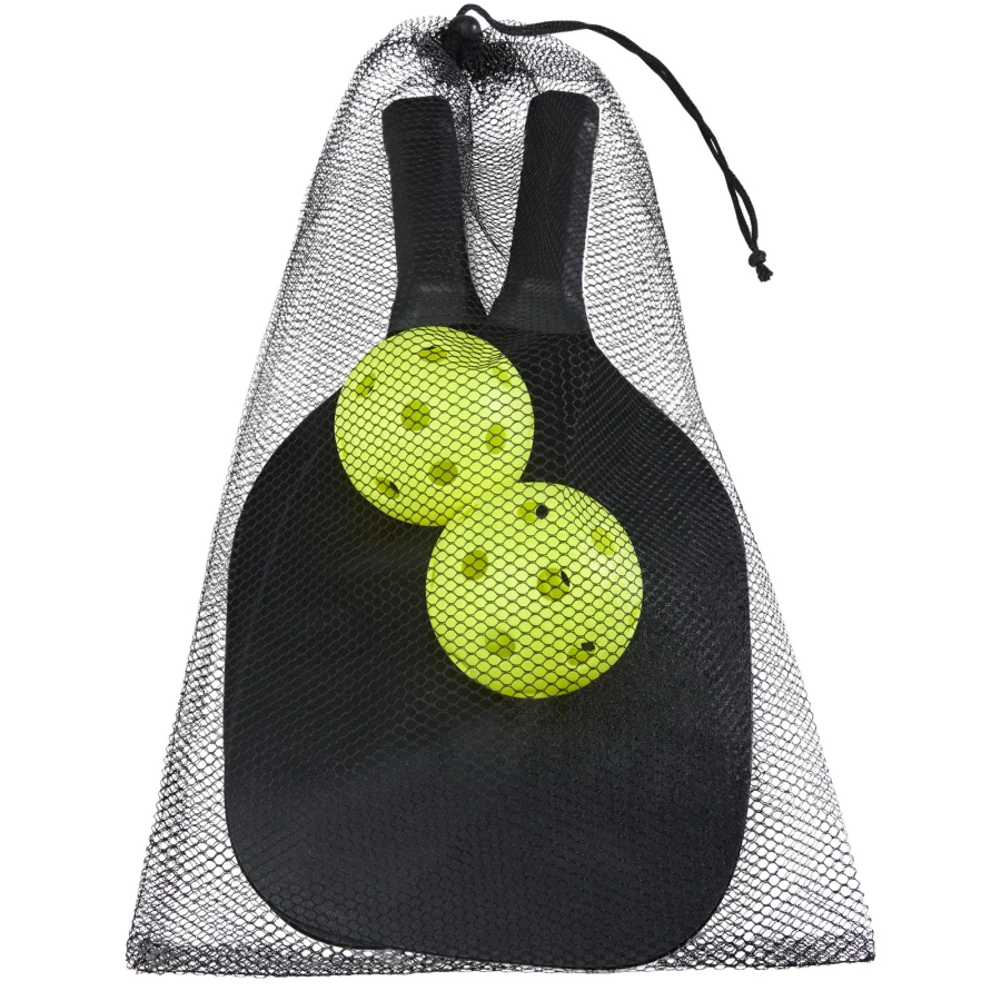 Ten zestaw rakietek wykonany z drewna bukowego zapewnia mnóstwo zabawy i ruchu dla dwojga na plaży, w parku lub w ogrodzie. Rakietki mają wymiary 40 x 20 x 0,7 cm i są pomalowane na czarny kolor, co zapewnia dużą powierzchnię do nadruku dowolnego logo. Uchwyty są oklejone taśmą PU, co zapewnia maksymalną przyczepność podczas intensywnej gry. Zestaw uzupełniają 2 piłeczki wykonane z tworzywa PP, zapakowane w siatkowe etui z poliestru o wymiarach 45 x 26 cm. Ostrzeżenie! Nieodpowiednie dla dzieci poniżej trzeciego roku życia. Małe części. Ryzyko zadławienia.