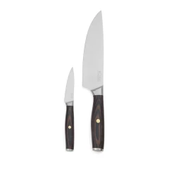 Zestaw noży kuchennych 2 szt., wykonane ze stali nierdzewnej pochodzącej z recyklingu z certyfikatem RCS, drewniane uchwyty, długość ostrza mniejszego noża: 8,5 cm, długość ostrza większego noża: 21 cm, całkowita zawartość materiałów z recyklingu obliczona w oparciu o wagę całkowitą przedmiotu: 23%, wyłącznie mycie ręczne