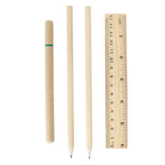 Zestaw szkolny, notatnik (ok. A5, 70 pustych kartek), piórnik na zamek błyskawiczny, długopis z trzonem z kartonu z recyklingu, 2 ołówki, linijka, temperówka i gumka