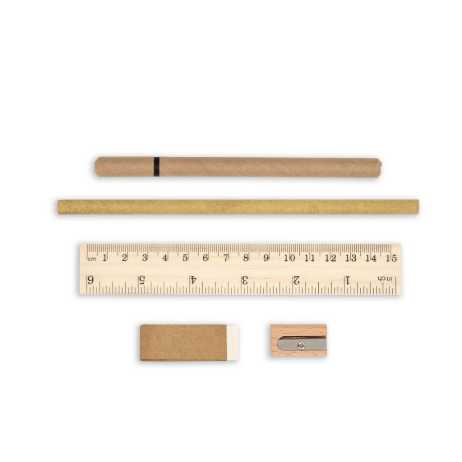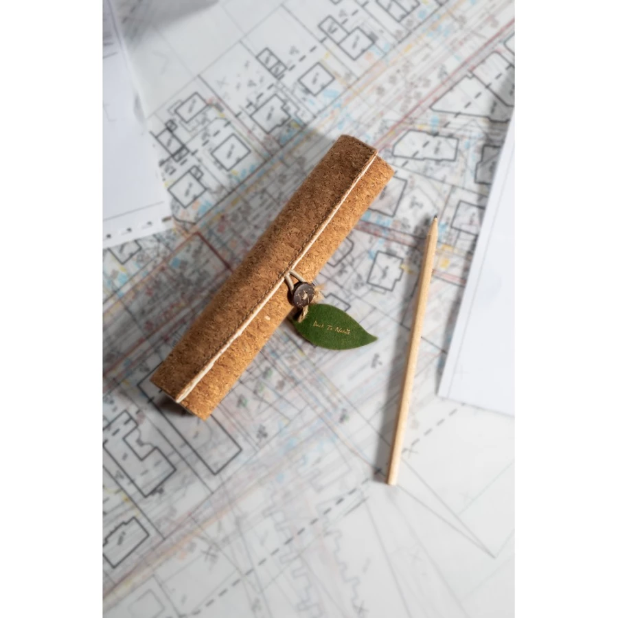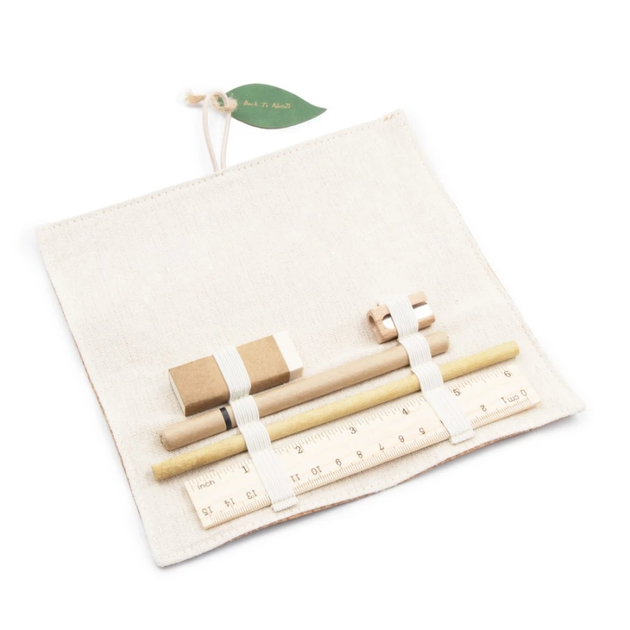 Zestaw szkolny w korkowym etui, linijka (15 cm/6 cali), długopis, ołówek (nienaostrzony), gumka i temperówka