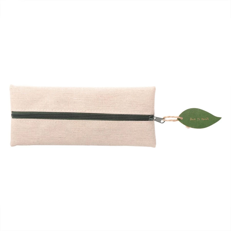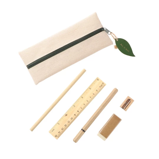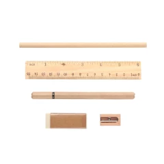 Zestaw szkolny w piórniku zamykanym na zamek błyskawiczny, w komplecie znajduje się: ołówek (nienaostrzony), długopis z wkładem w niebieskim kolorze, linijka (15 cm / 6 cali), gumka oraz temperówka, produkt wykonany między innymi z bawełny i drewna