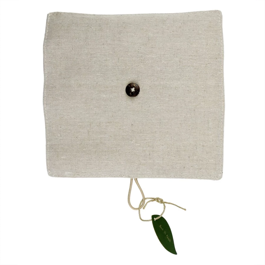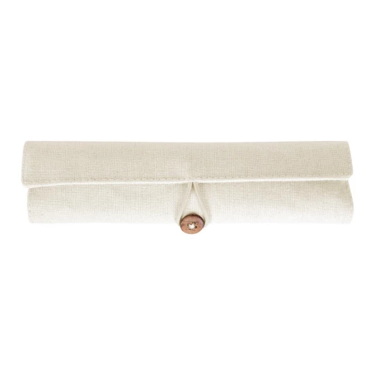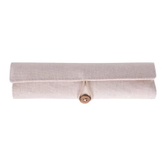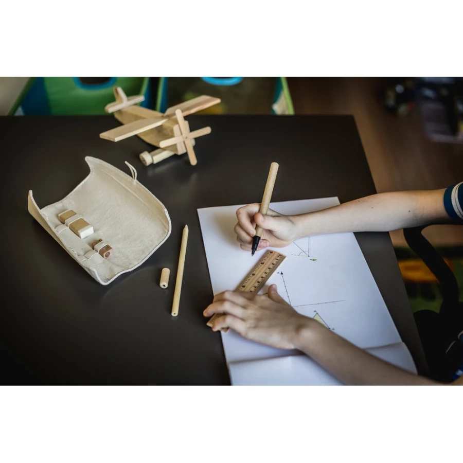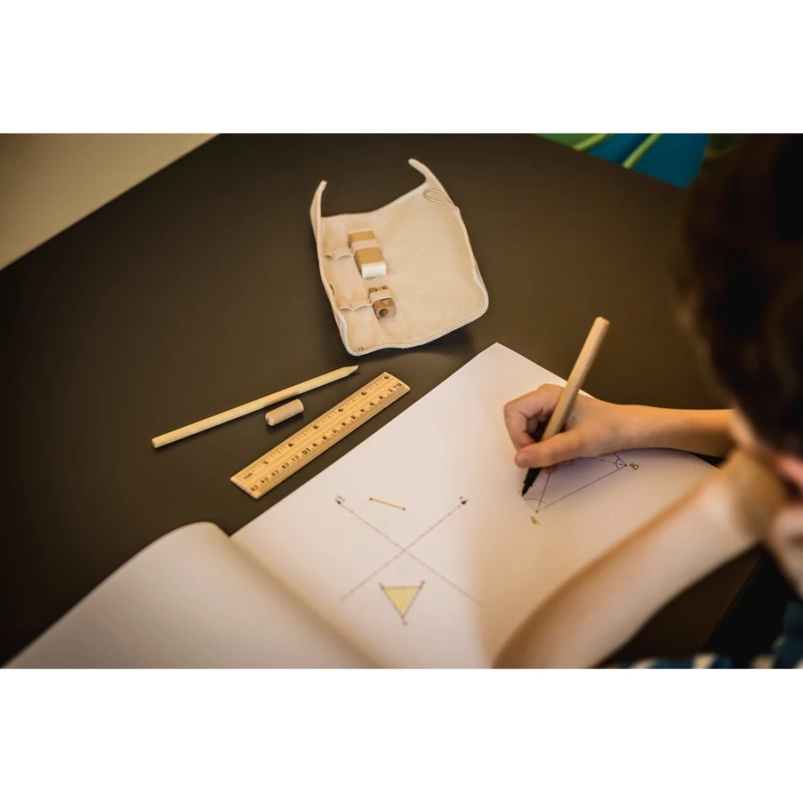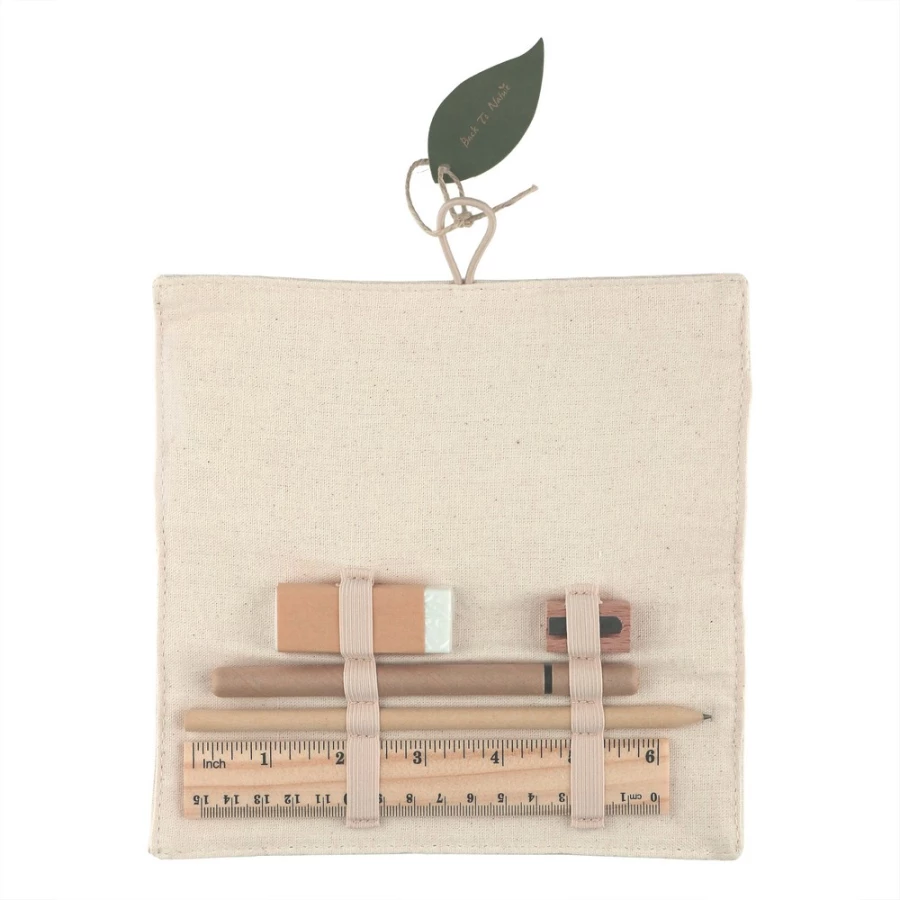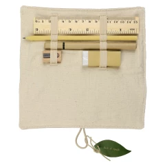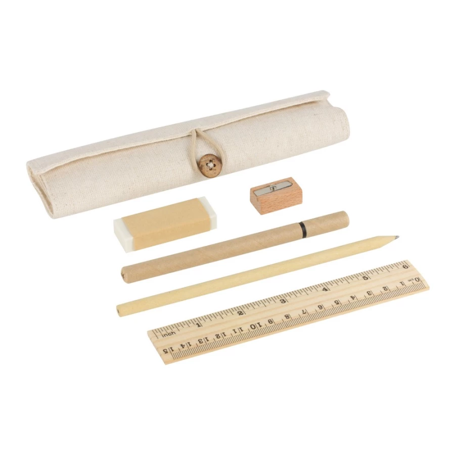Zestaw szkolny w bawełnianym etui, linijka, ołówek, długopis, gumka i temperówka