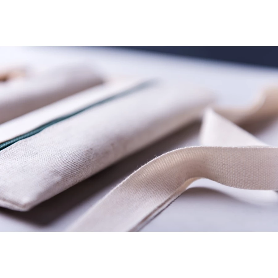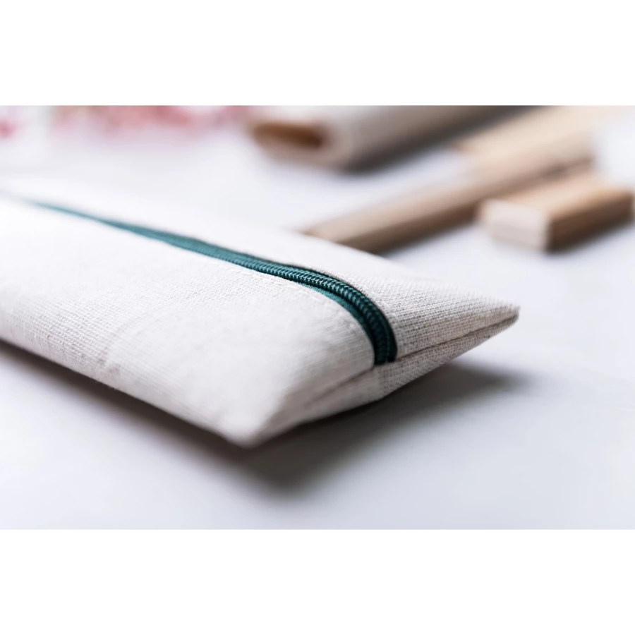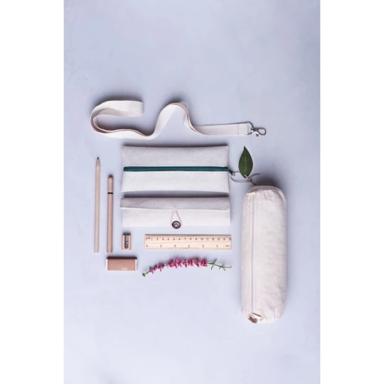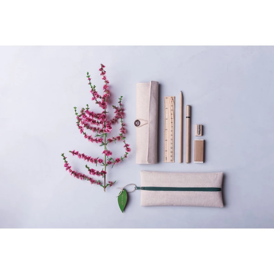Zestaw szkolny w piórniku zamykanym na zamek błyskawiczny, w komplecie znajduje się: ołówek (nienaostrzony), długopis z wkładem w niebieskim kolorze, linijka (15 cm / 6 cali), gumka oraz temperówka, produkt wykonany między innymi z bawełny i drewna