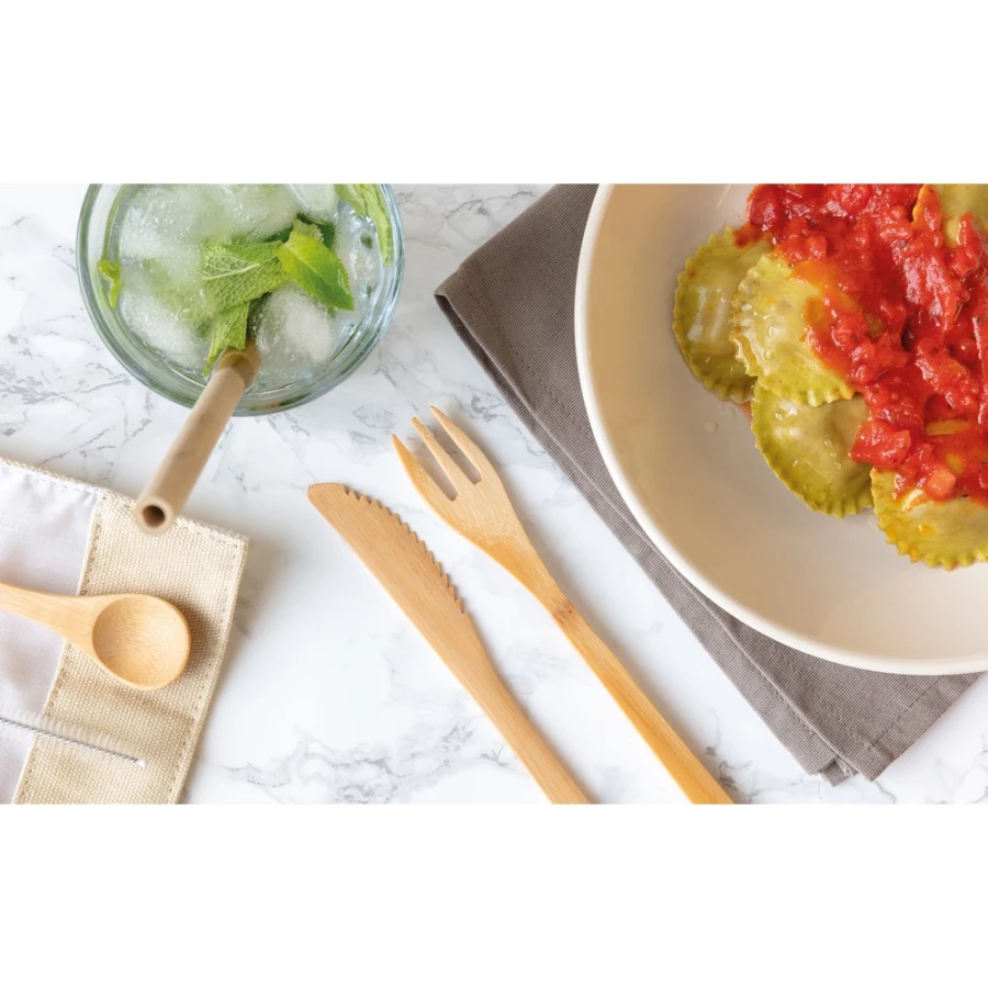 Zestaw 4 bambusowych sztućców wielokrotnego użytku: łyżka, widelec, nóż, słomka, materiałowy pokrowiec i czyścik w komplecie, ślad węglowy produktu: 0,61 kg CO2